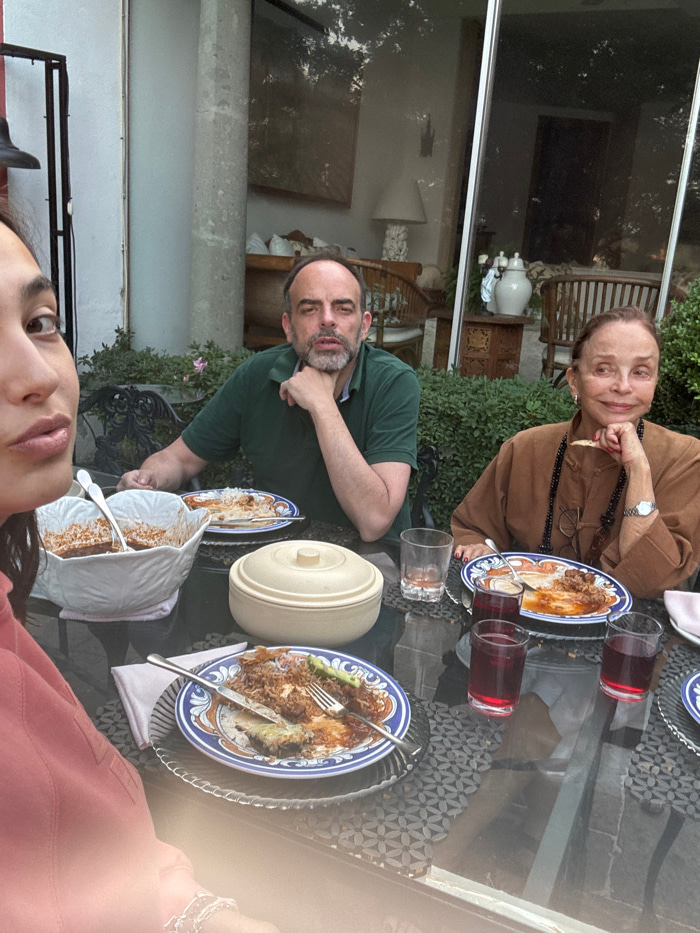 Three individuals are seated at an outdoor glass table with metal lattice detailing. Plates of food, mostly consumed, and glasses of red liquid are present. An older woman in brown attire is seated at…read more