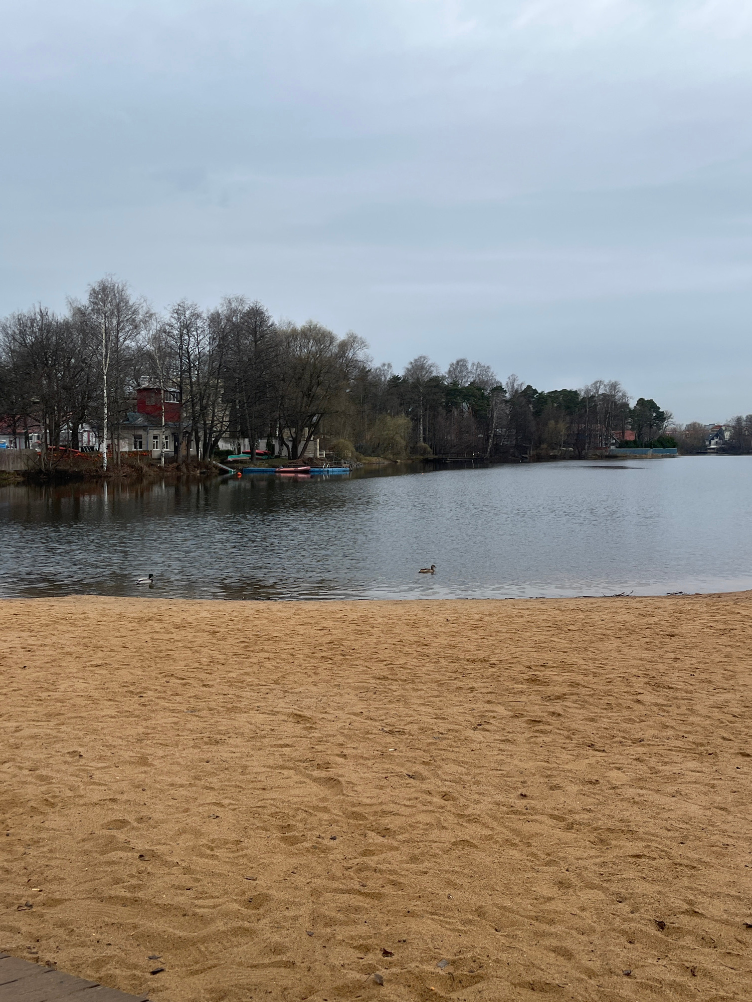 The image depicts a waterfront scene in Saint Petersburg, Russia. The view includes a body of water, likely a lake or river, bordered by a sandy beach on one side and trees and buildings on the other.…read more