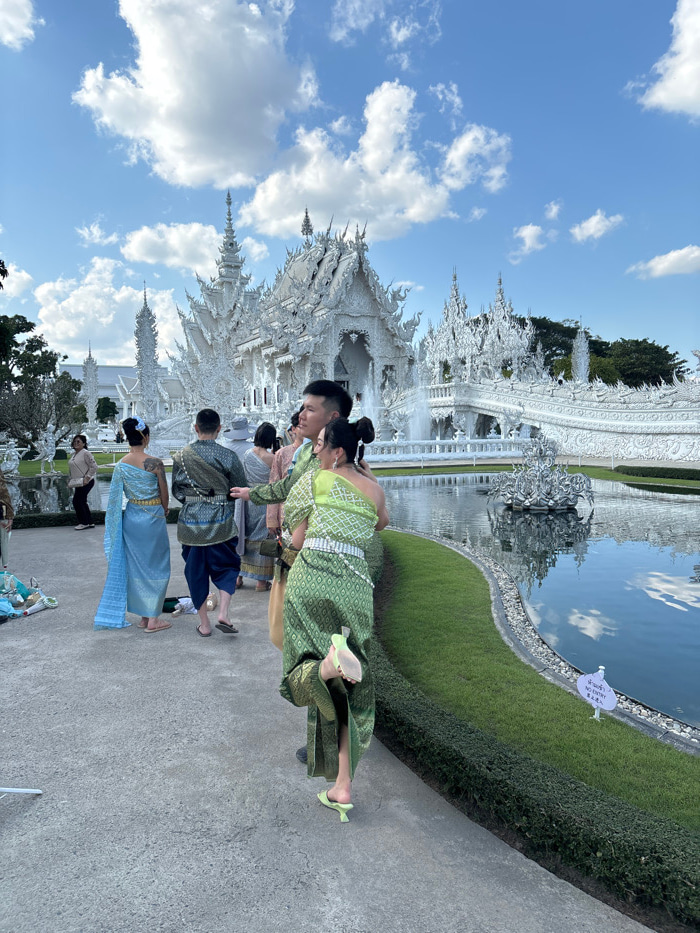 The image depicts a daytime scene at Wat Rong Khun, commonly known as the White Temple, in Ban Rong Khun, Thailand. The temple, an elaborately ornate structure rendered entirely in white with intricat…read more