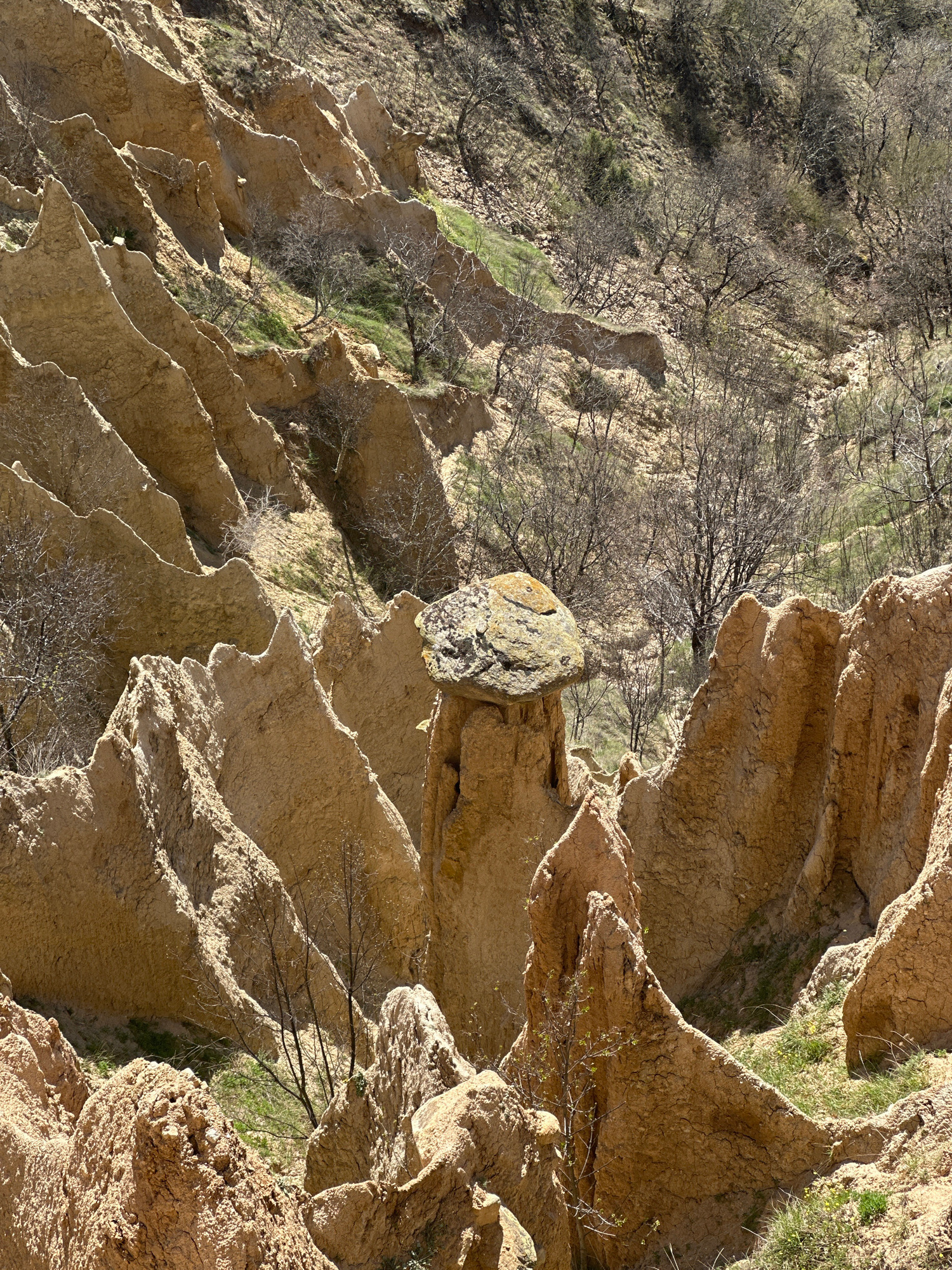 This is an overhead view of the Stob Earth Pyramids in Stob, Bulgaria, a geological formation characterized by pointed rock formations, soil erosion, and sparse vegetation. The earth pyramids are pred…read more