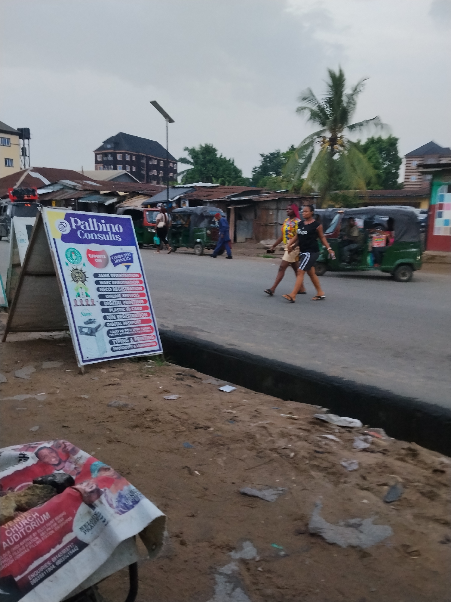 The image depicts a street scene in Aba, Nigeria. A prominent sign for "Palbino Consults" advertises computer services, including JAMB registration, WAEC registration, NECO registration, online servic…read more
