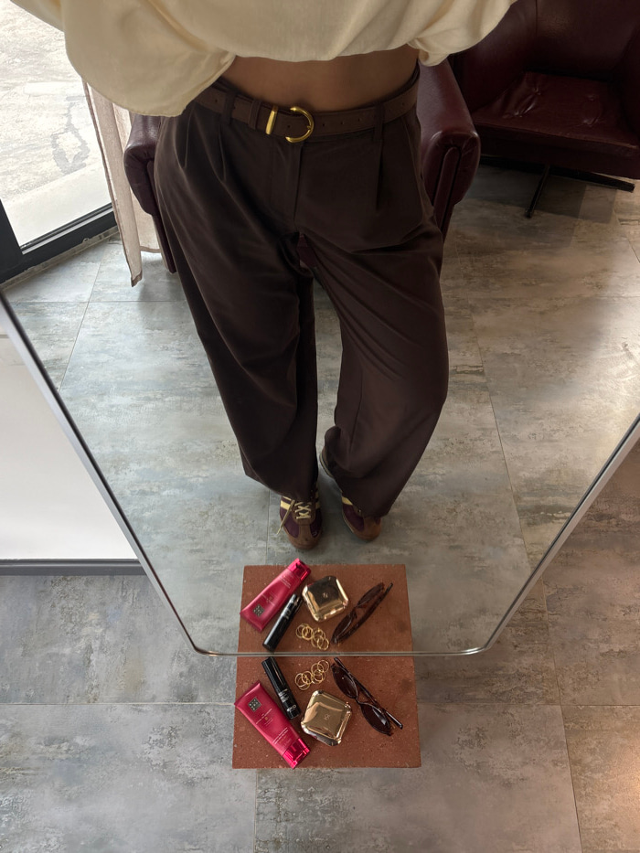 This image depicts a mirror reflection of a person standing indoors, identified as being in Zovuni, Armenia. The person is visible from the upper torso down, wearing an off-white top, dark brown wide-…read more