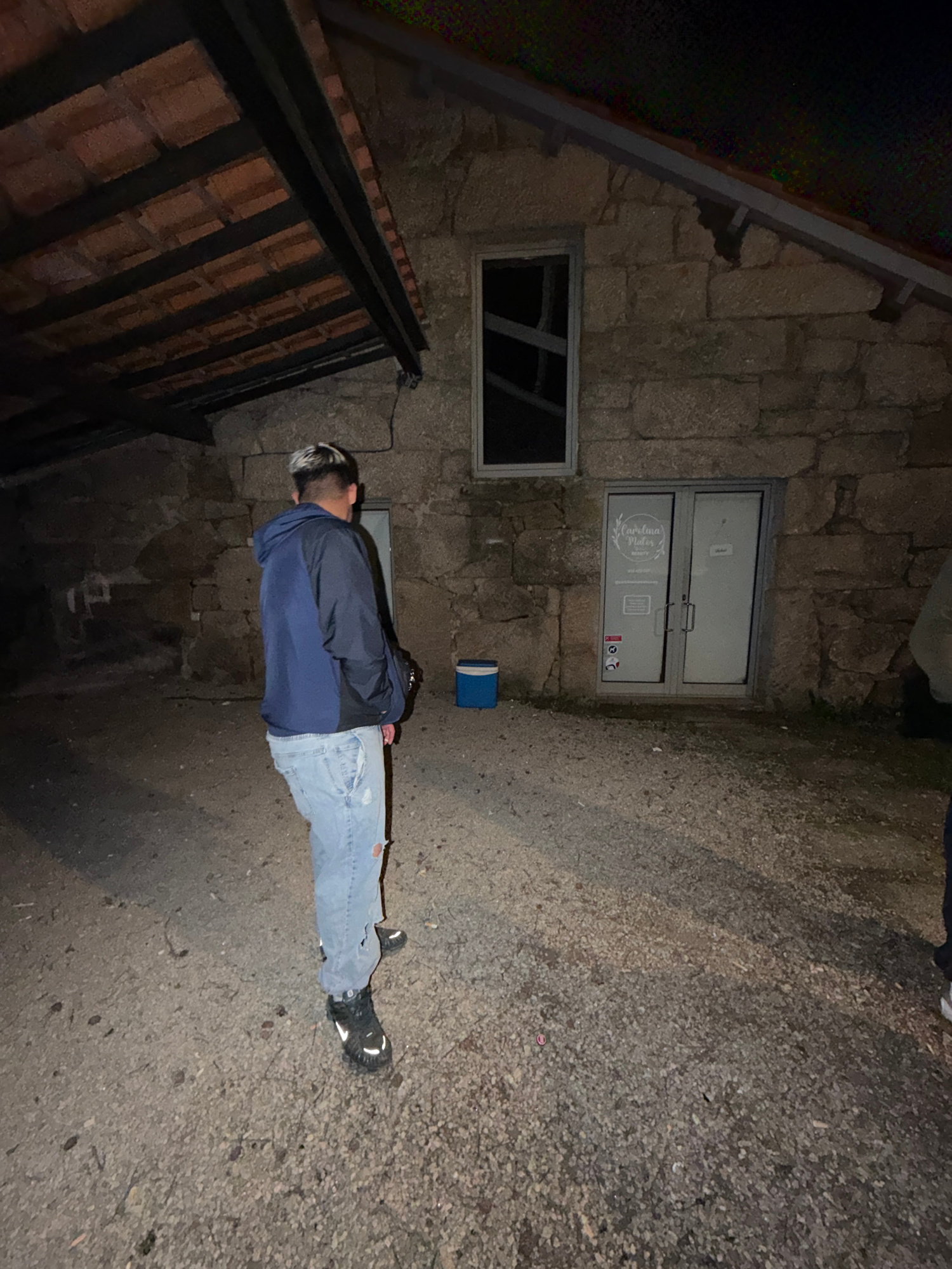 A man with bleached hair, wearing a blue jacket, ripped jeans, and dark sneakers stands on a paved surface in an outdoor area. A stone building with two windows is behind him. The larger window has an…read more