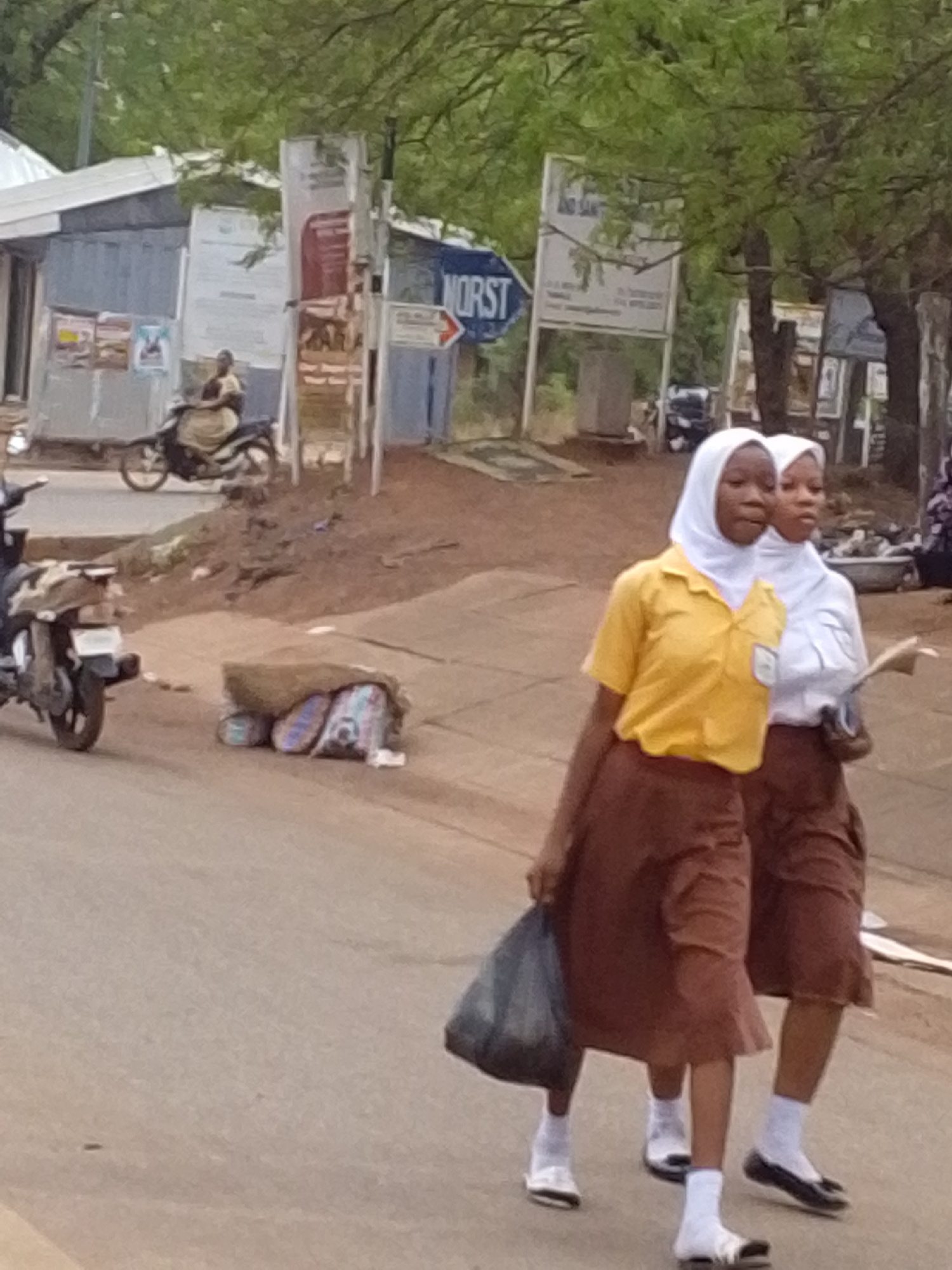 Two girls wearing white headscarves and school uniforms walk on a paved road. The girl in the foreground has a yellow shirt and a brown skirt, carrying a dark plastic bag. The other girl wears a whiteβ¦read more