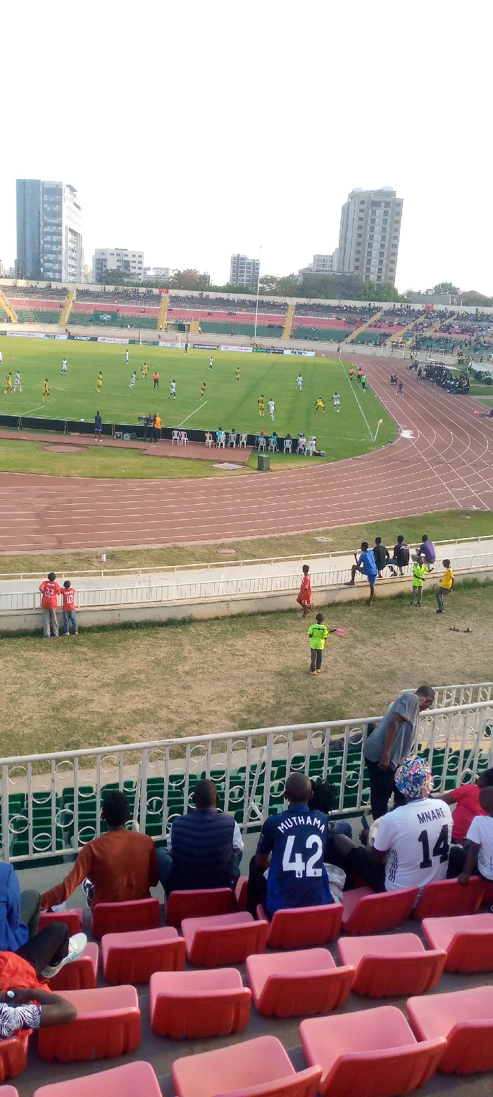 An elevated view shows a stadium during a soccer game. A track encircles the field. Spectators occupy the stadium seating. Buildings are visible in the background. In the foreground, stadium seats are…read more