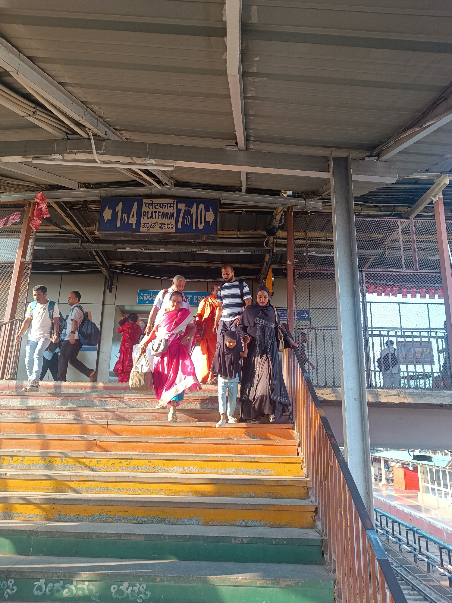 The image depicts a scene at a train station in Bengaluru, India. People are descending the stairs from a pedestrian bridge that leads to the platforms. A sign above the stairway indicates directions to "Platform 1 to 4" and "Platform 7 to 10" in both English and Kannada script. A woman in a pink sari is descending the stairs, holding a bag. Behind her, a man in a striped shirt is also descending. A woman in a black abaya and hijab is also descending the stairs, holding the hand of a small child. On the left side of the stairs, other individuals are walking down, including a man in a white t-shirt and jeans. The stairs themselves are painted with alternating stripes of yellow, orange, and green. The metal railing of the stairs is visible on the right side. In the background, part of the train station and rail tracks are visible. The structure of the pedestrian bridge above is visible, featuring a metal roof and supporting pillars. The writing on the bottom of the stairs is in Kannada. | Open Wire