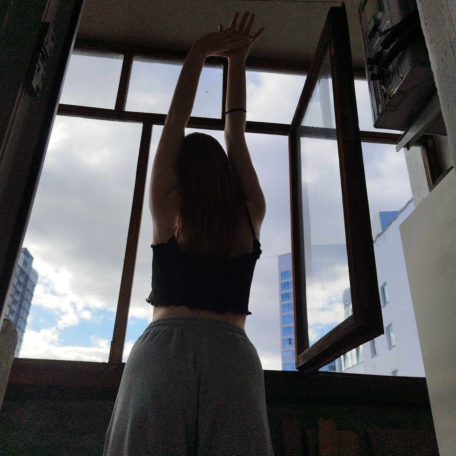 The image depicts a woman, seen from the back, stretching her arms upwards in front of an open window. She is wearing a dark crop top and grey sweatpants. The window frames a view of the city of Yekat…read more
