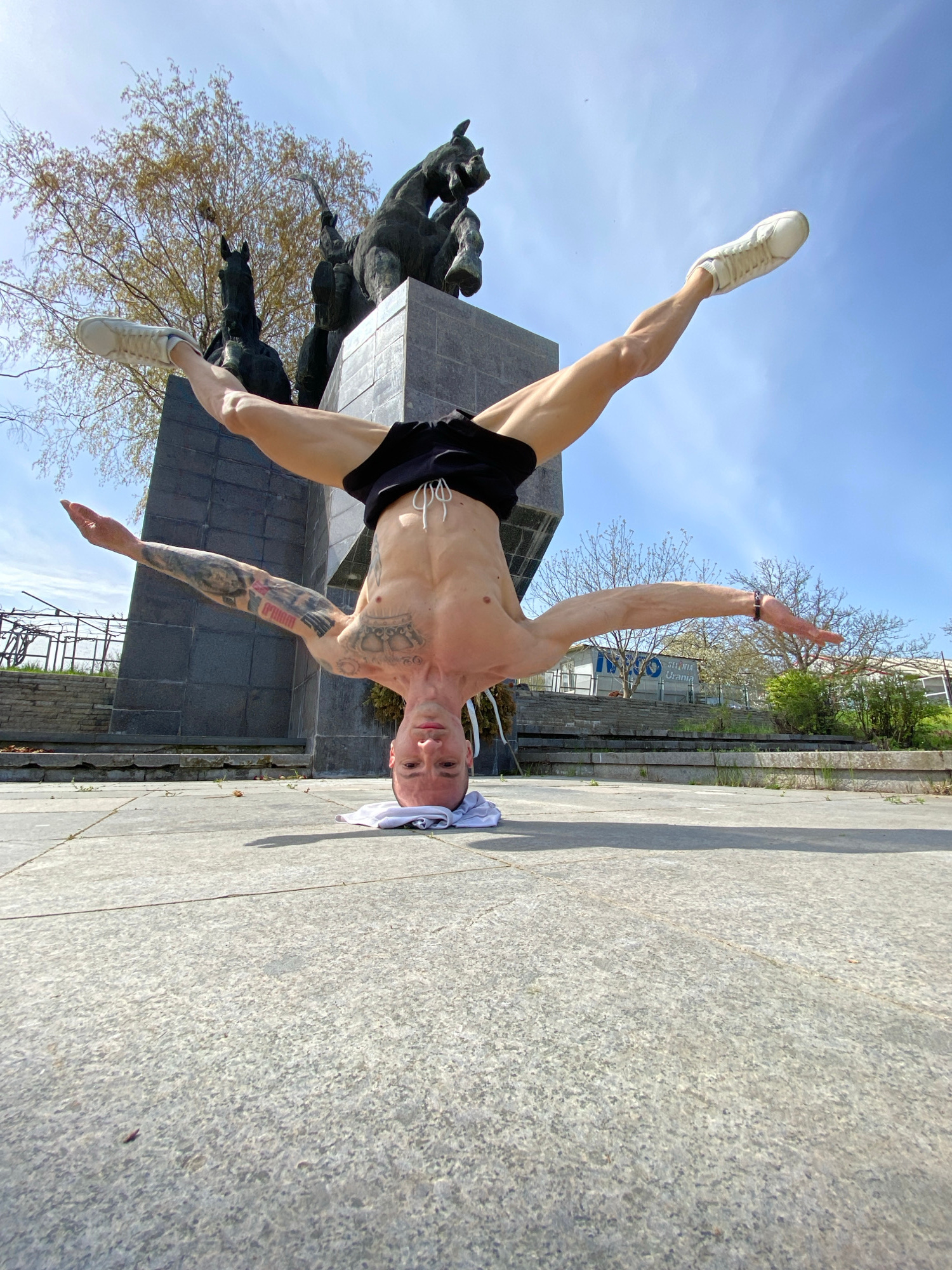 A man is photographed at ground level in an outdoor scene. He is balancing on his head, with his legs extended outwards at roughly a 90-degree angle. He is wearing black shorts and white sneakers. His…read more