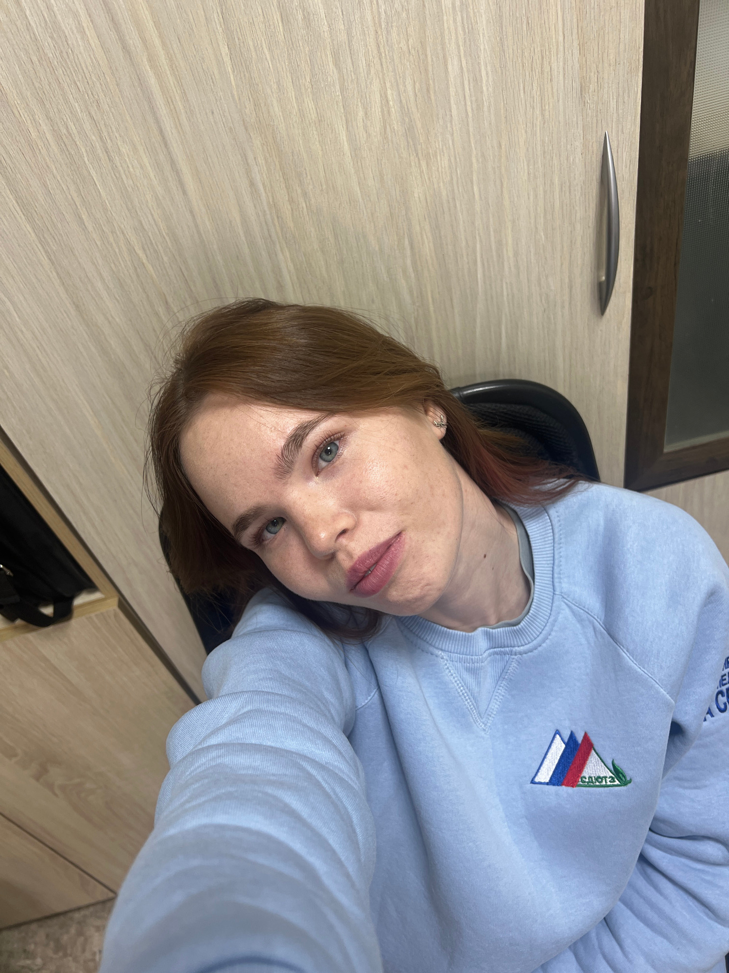 A person with light brown hair and blue eyes is sitting in a black chair facing the camera. They are wearing a light blue sweatshirt with a triangular patch featuring red, white, and blue stripes alon…read more
