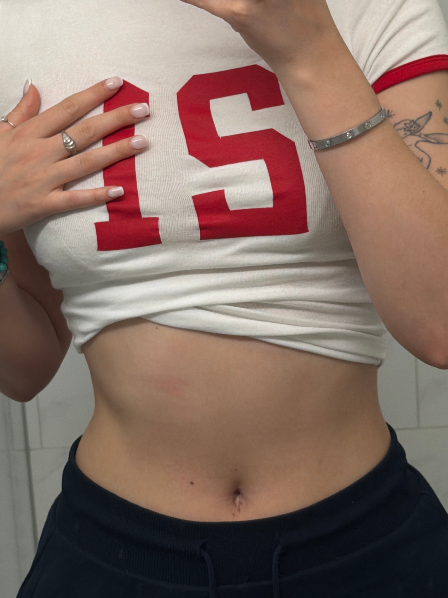 The image shows a person lying on their back, wearing a white t-shirt with a red "15" on it, and dark-colored shorts or pants. The person has fair skin and manicured nails with a French tip. A silver…read more