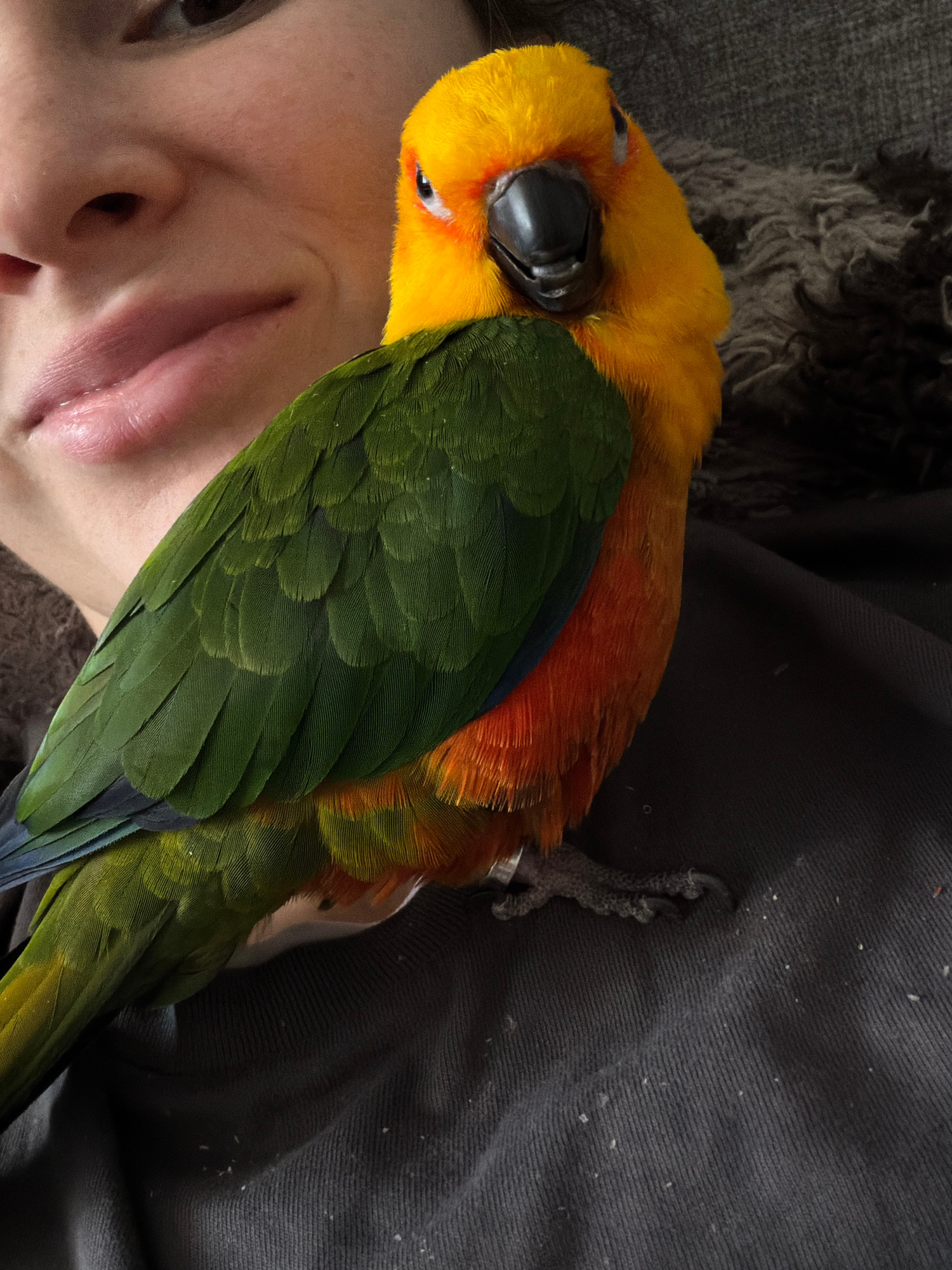 A close-up photograph shows a person lying on their back with a colorful parrot perched on their face and shoulder. The parrot has bright yellow feathers on its head, transitioning to orange and red o…read more