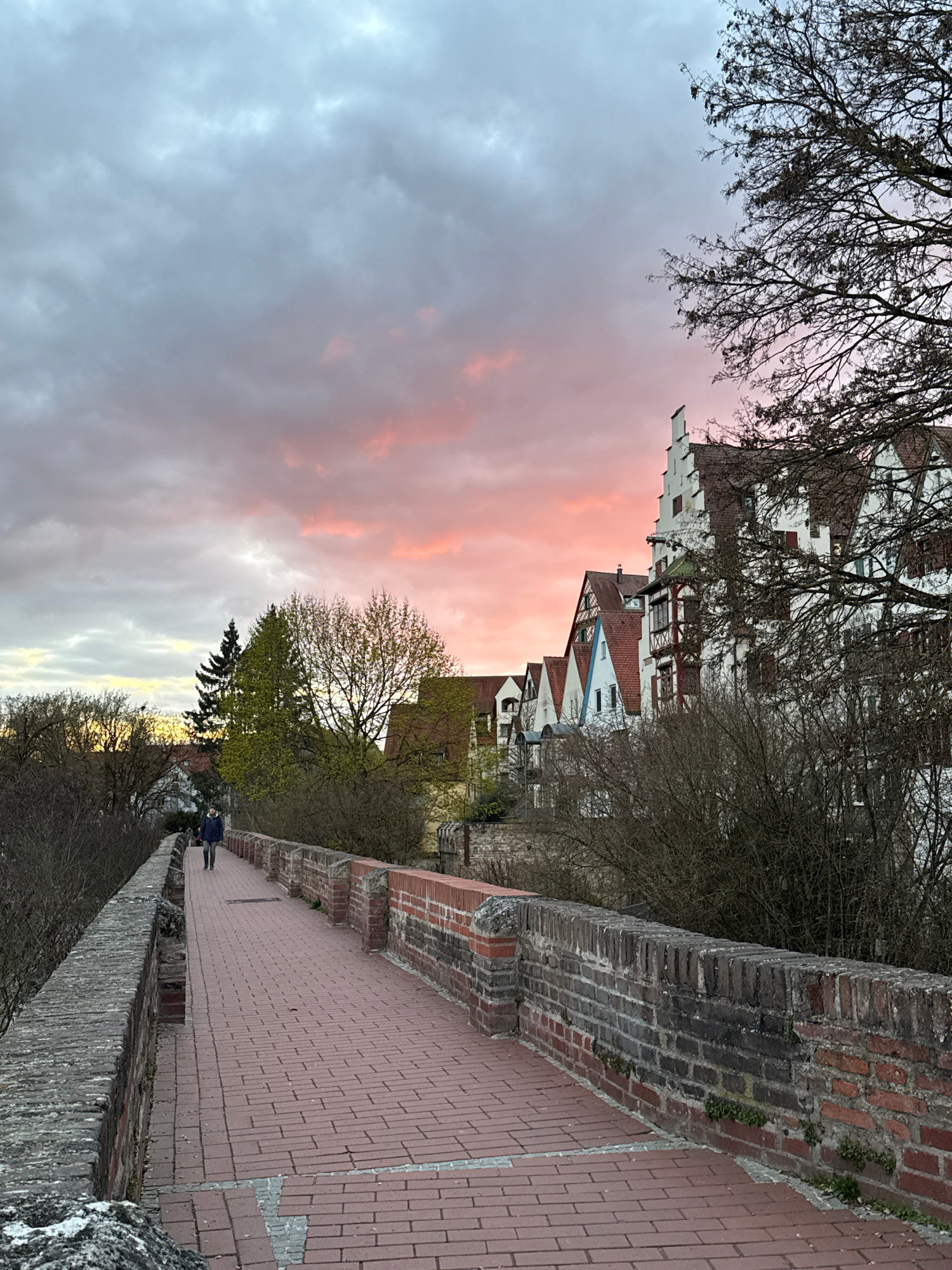 The image depicts a pedestrian walkway in the city of Ulm, Germany, specifically a section along the historic city wall or "Mauerweg," likely near the Fischerviertel, at dusk. The upper portion of th…read more