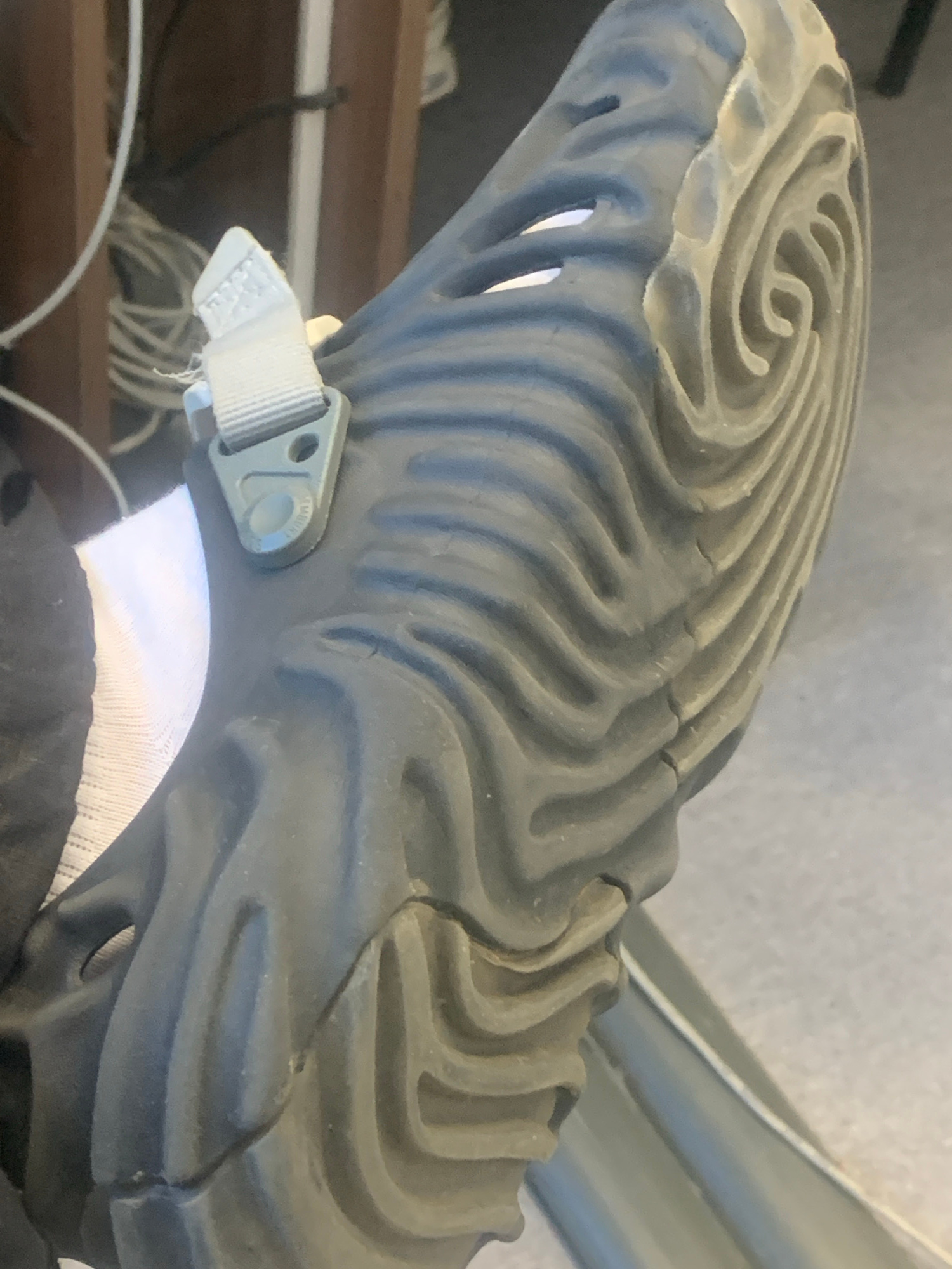 The image shows a close-up of the sole of a gray Crocs-style shoe. The sole has a swirling, ridged pattern. A light gray, adjustable strap with a buckle is attached to the side of the shoe. In the bac…read more
