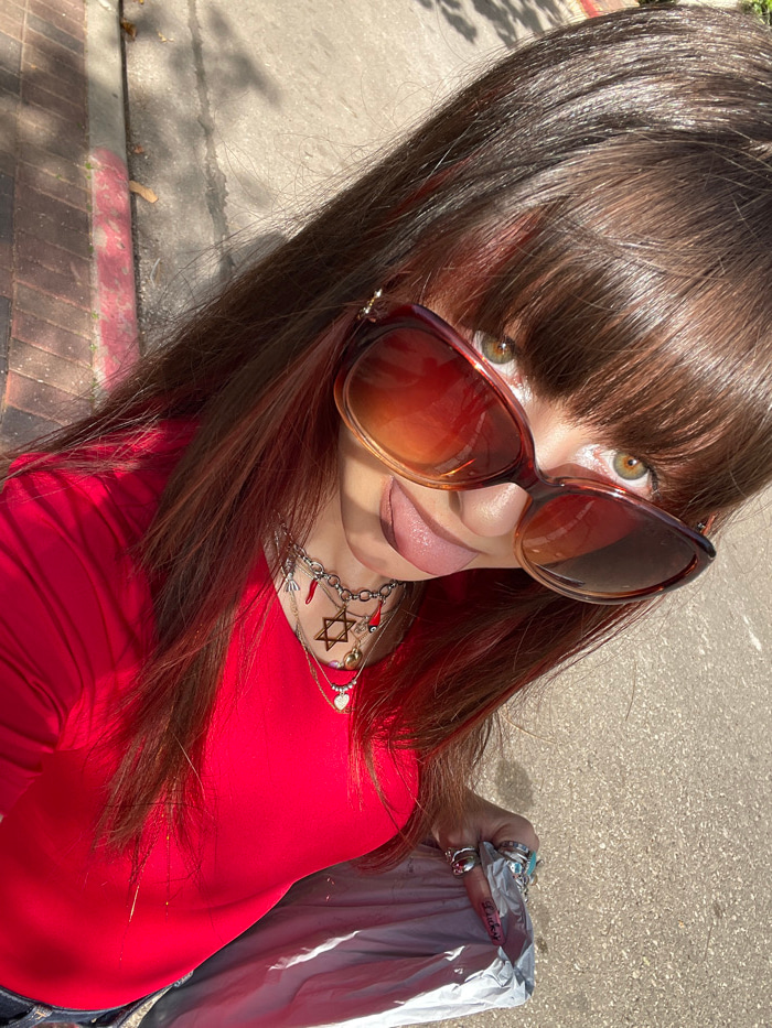 A high-angle, close-up photograph depicts an individual outdoors in the city of Raanana, Israel, under bright sunlight. The subject, appearing female, has long, dark brown hair with reddish highlights…read more