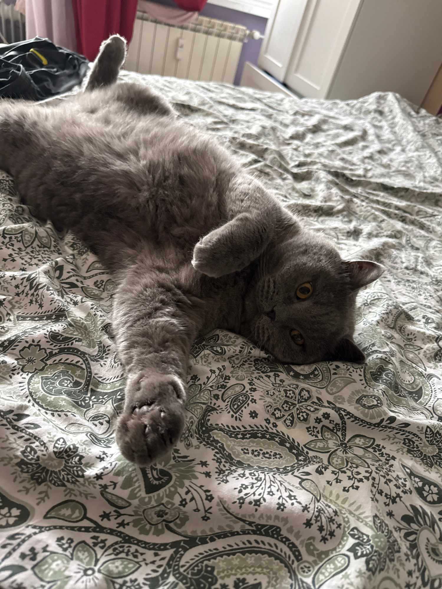 A fluffy grey cat is the central subject, comfortably lounging on its back on a bed covered with a patterned duvet. The cat has thick, plush grey fur and striking amber-orange eyes, which are open and…read more