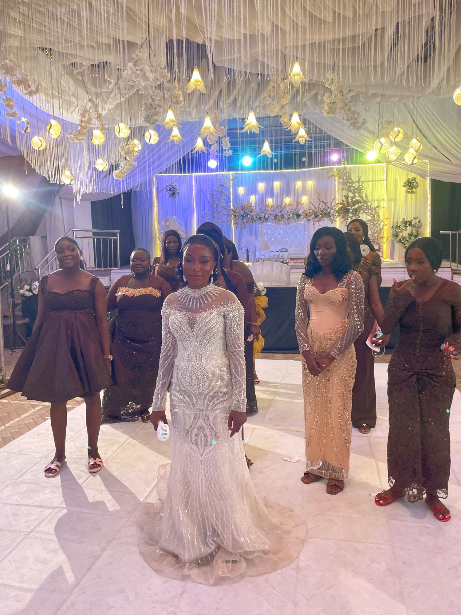 The image shows a group of women indoors, at what appears to be a wedding reception in an unknown city. In the center, a woman in a white wedding dress is surrounded by other women in brown and gold d…read more