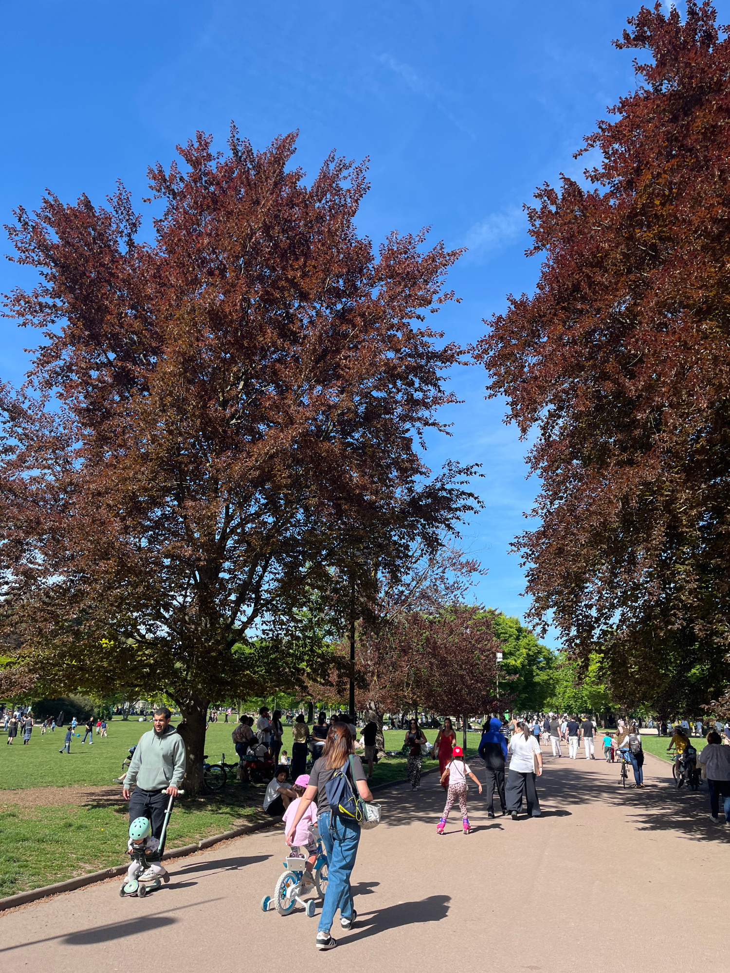 The image, taken in a park or promenade in Lyon, France, is viewed as if upright, showcasing a sunny day under a bright blue sky with scattered wispy clouds. The scene is dominated by the lush canopy…read more