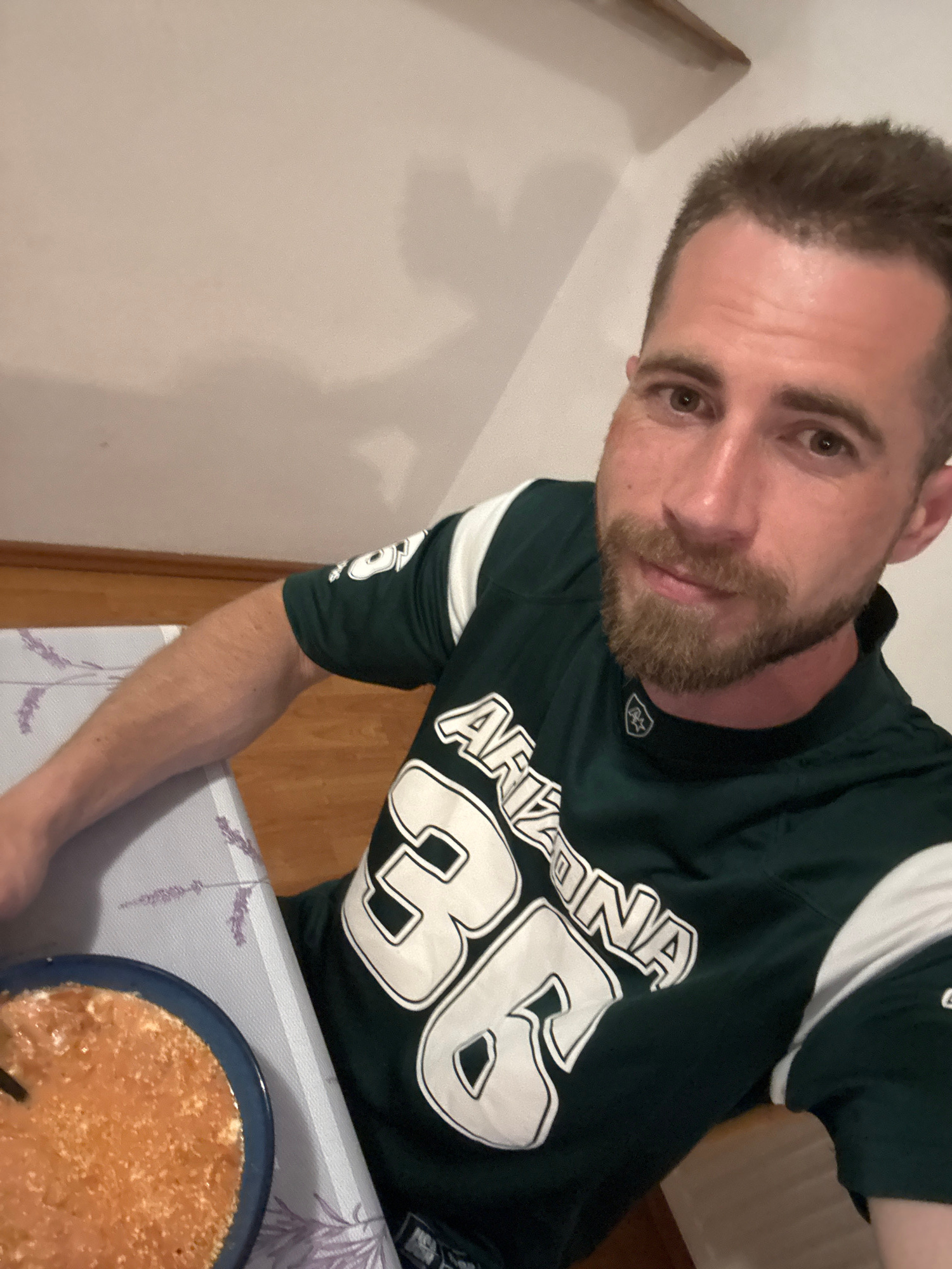 A fair-skinned man with brown hair and a beard is wearing a green and white "Arizona 36" jersey. He's positioned at a table with a blue plate containing a brown, textured food item, likely a dessert o…read more