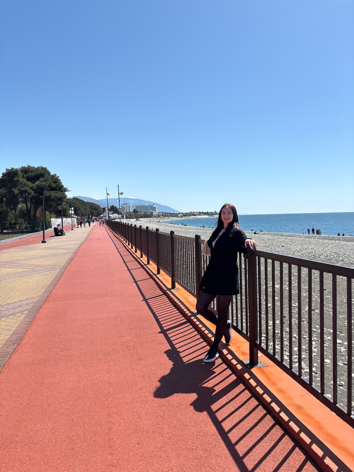 This image presents a bright and sunny coastal scene in Sochi, Russia, taken from an elevated perspective. The central subject is a young woman with dark hair, wearing a black coat or dress, dark legg…read more