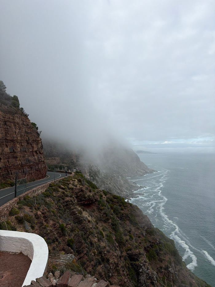 The image displays a coastal scene on Chapman's Peak Drive, located near Hout Bay in Cape Town, South Africa. The environment is overcast and foggy, with a uniform grey sky. On the left, a steep, redd…read more