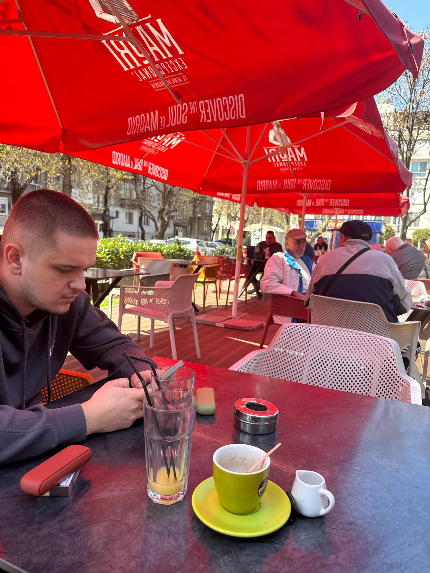 The image depicts an outdoor cafe scene in Plovdiv, Bulgaria. A man sits at a dark-colored table under a large red "WAM" branded umbrella. The table holds a glass of liquid, a green cup and saucer, a…read more