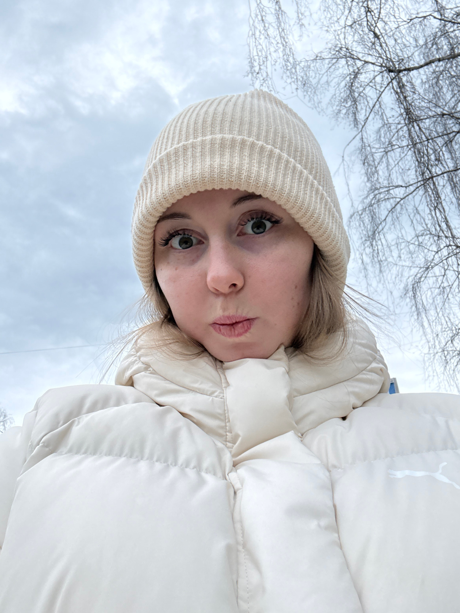 A young woman, possibly white, is wearing a light beige knitted hat and a light beige puffy jacket with a white Puma logo, gazing upwards. The background suggests an outdoor setting in winter, with a…read more