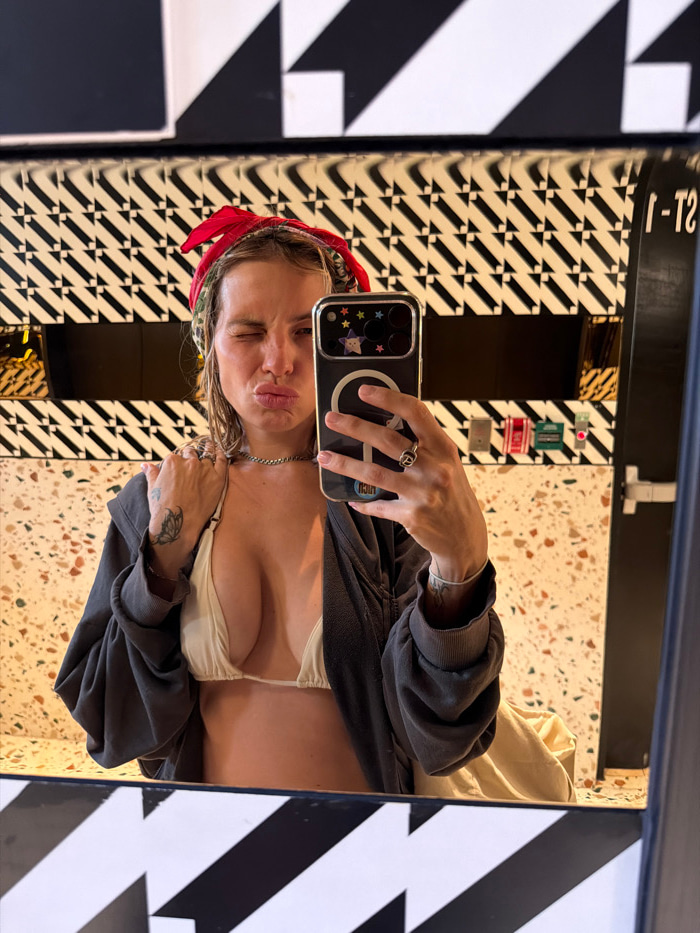 A mirror selfie captures a woman wearing a beige bikini top and a gray hoodie. She has a red bandana in her hair and is holding a phone with a clear case adorned with cartoon stickers. Her face has a…read more