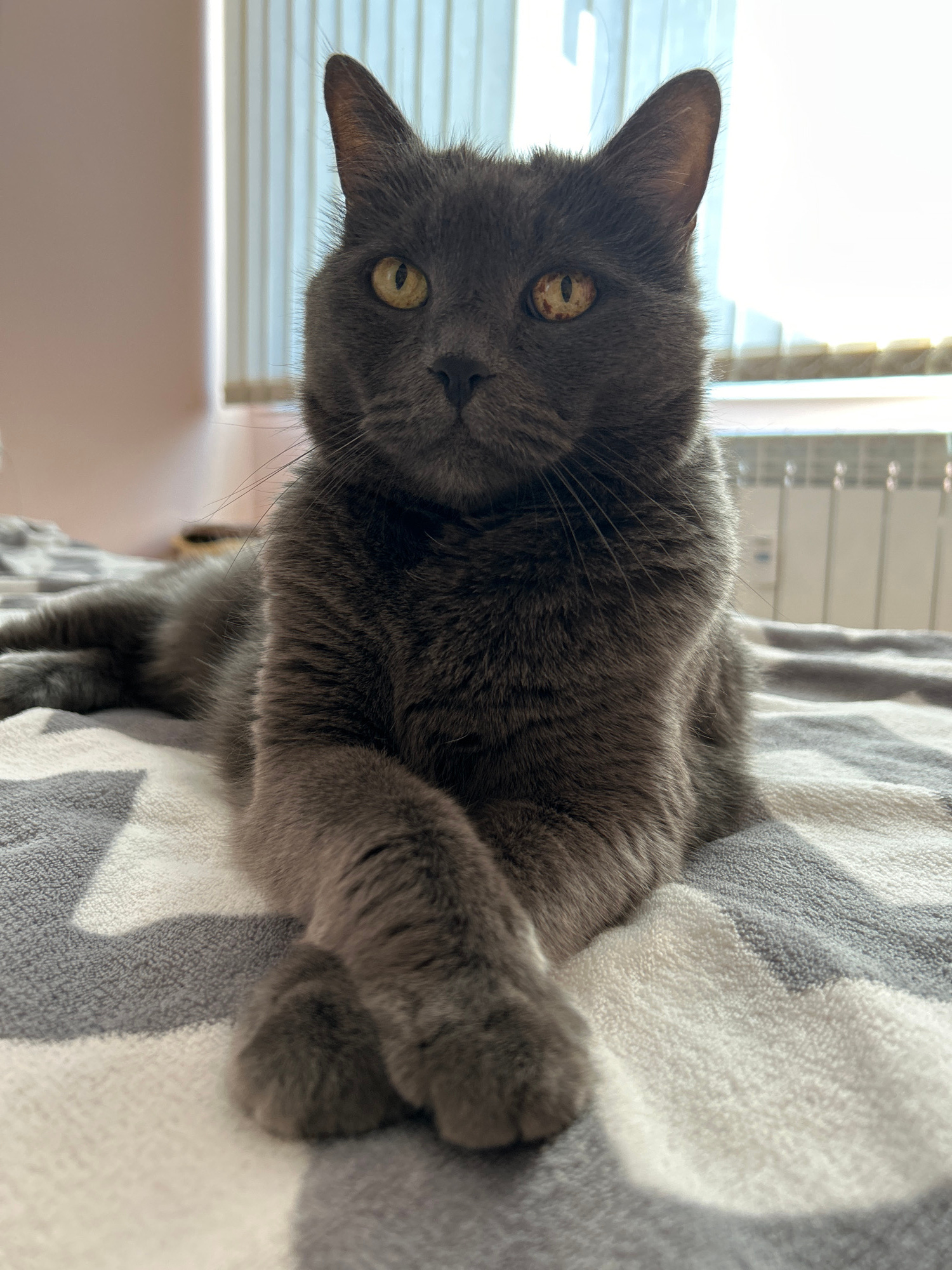 A gray cat with yellow eyes lies on a gray and white striped blanket. A window with blinds is visible in the background. The location is unknown.