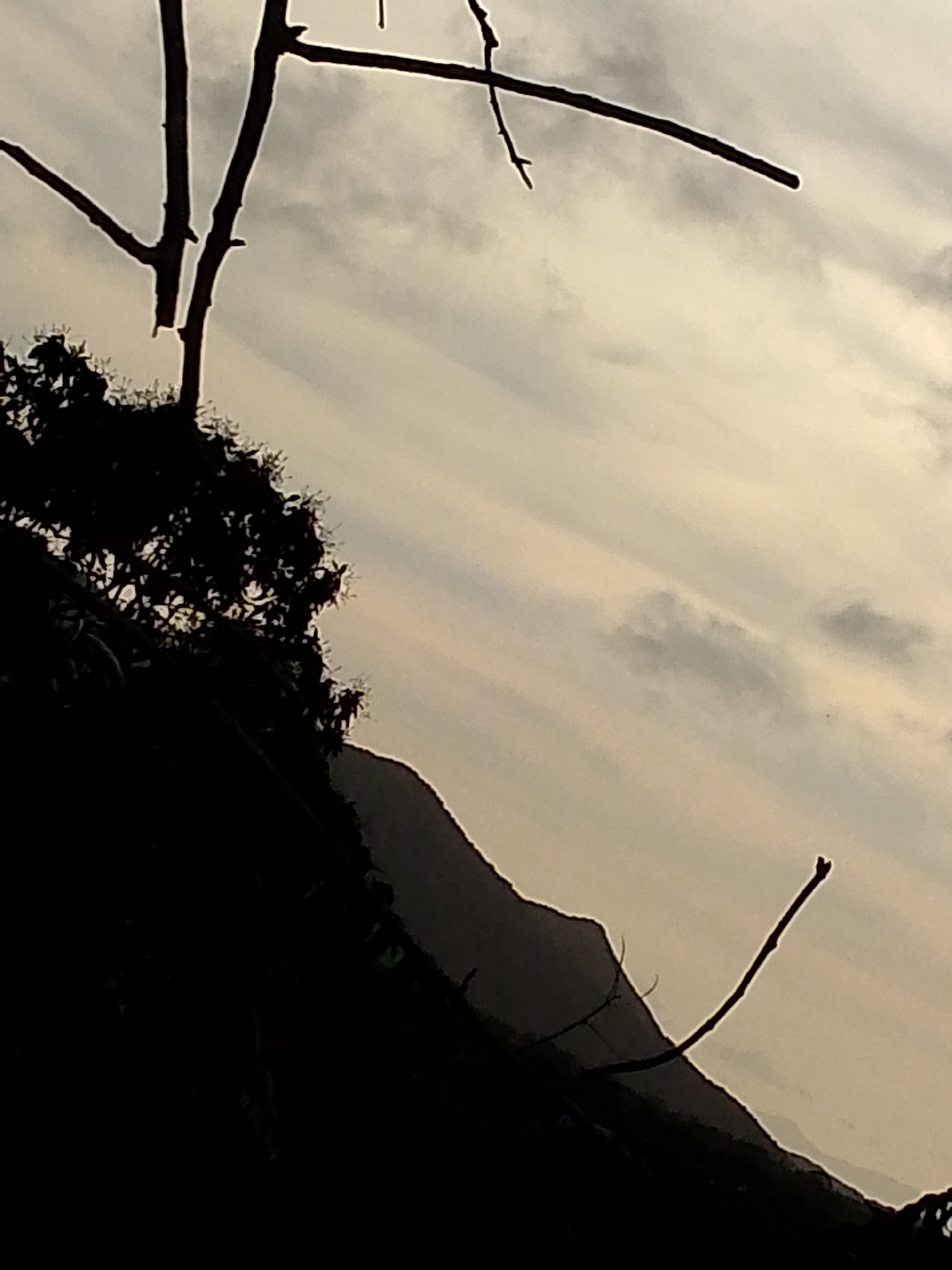 The image shows a landscape in Juan Griego, Venezuela, at either dusk or dawn. The scene is dominated by a dark silhouette of vegetation, possibly a hillside or a densely vegetated slope. Behind the d…read more