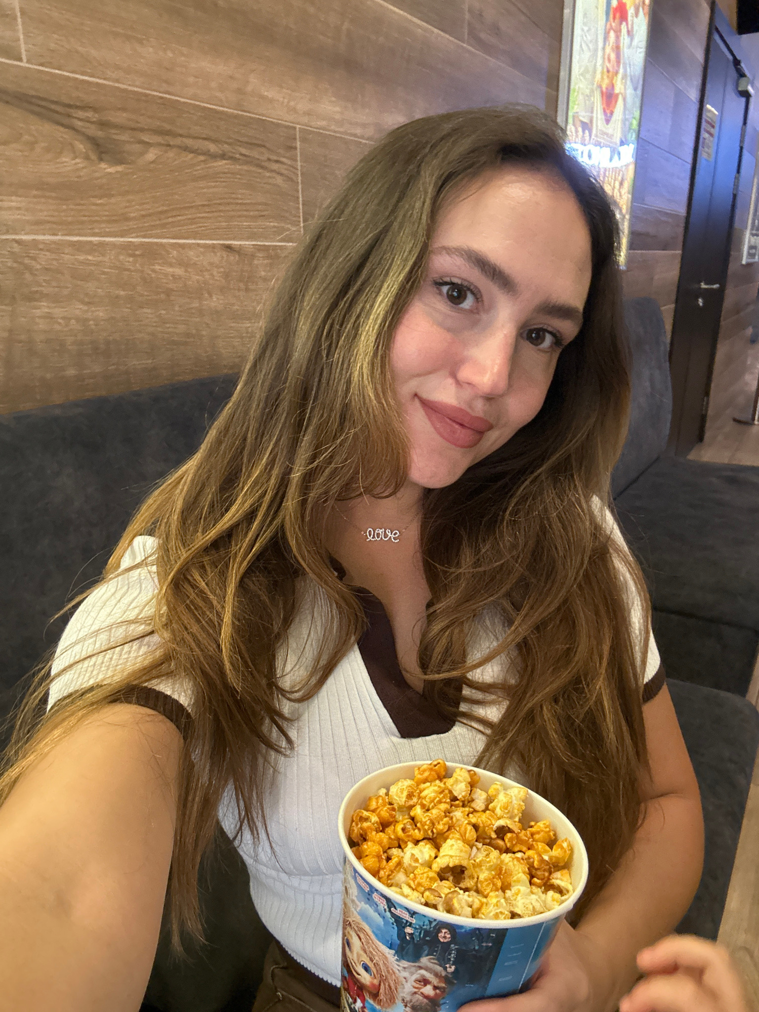 A young woman with long, brown hair sits on a dark gray couch, holding a blue bucket of caramel popcorn. She is wearing a white, long-sleeved shirt and a necklace. The background consists of a light b…read more