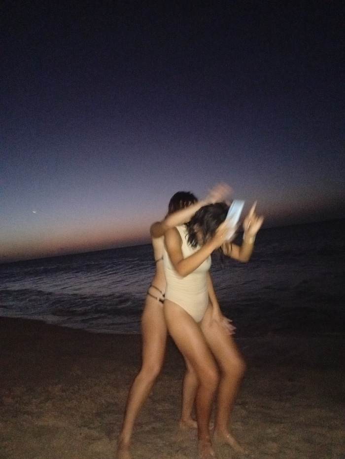 Two young women, clad in beach attire, stand on a sandy shoreline at dusk. The woman in front wears a light-colored one-piece swimsuit, while the other sports a bikini. One is holding a mobile device…read more