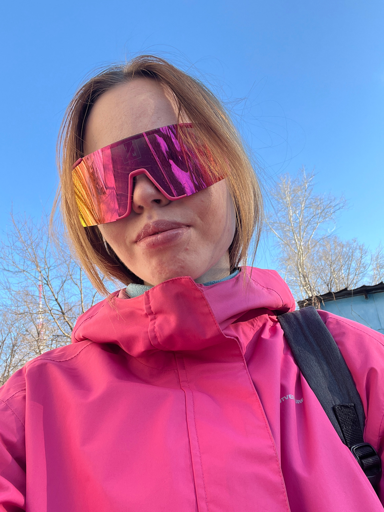A person wearing large, futuristic pink and gold sunglasses and a pink jacket is looking upward at the camera. The sky is visible in the background, along with bare tree branches and a building. The p…read more