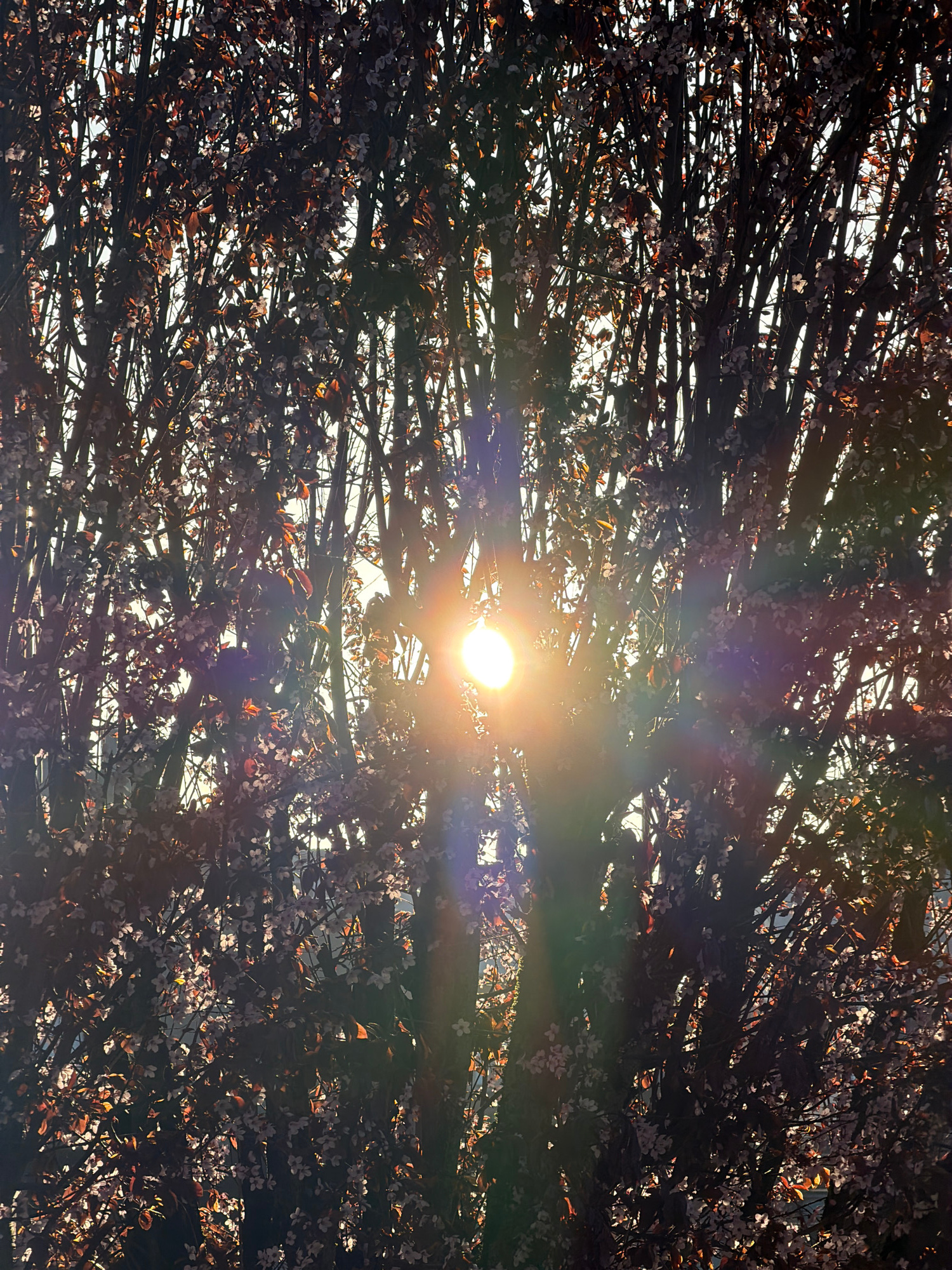 The image displays a back-lit tree, observed in Esch-sur-Alzette, Luxembourg. The sun, a bright orb with prominent lens flare and radiating light beams, is visible slightly above the center of the fra…read more