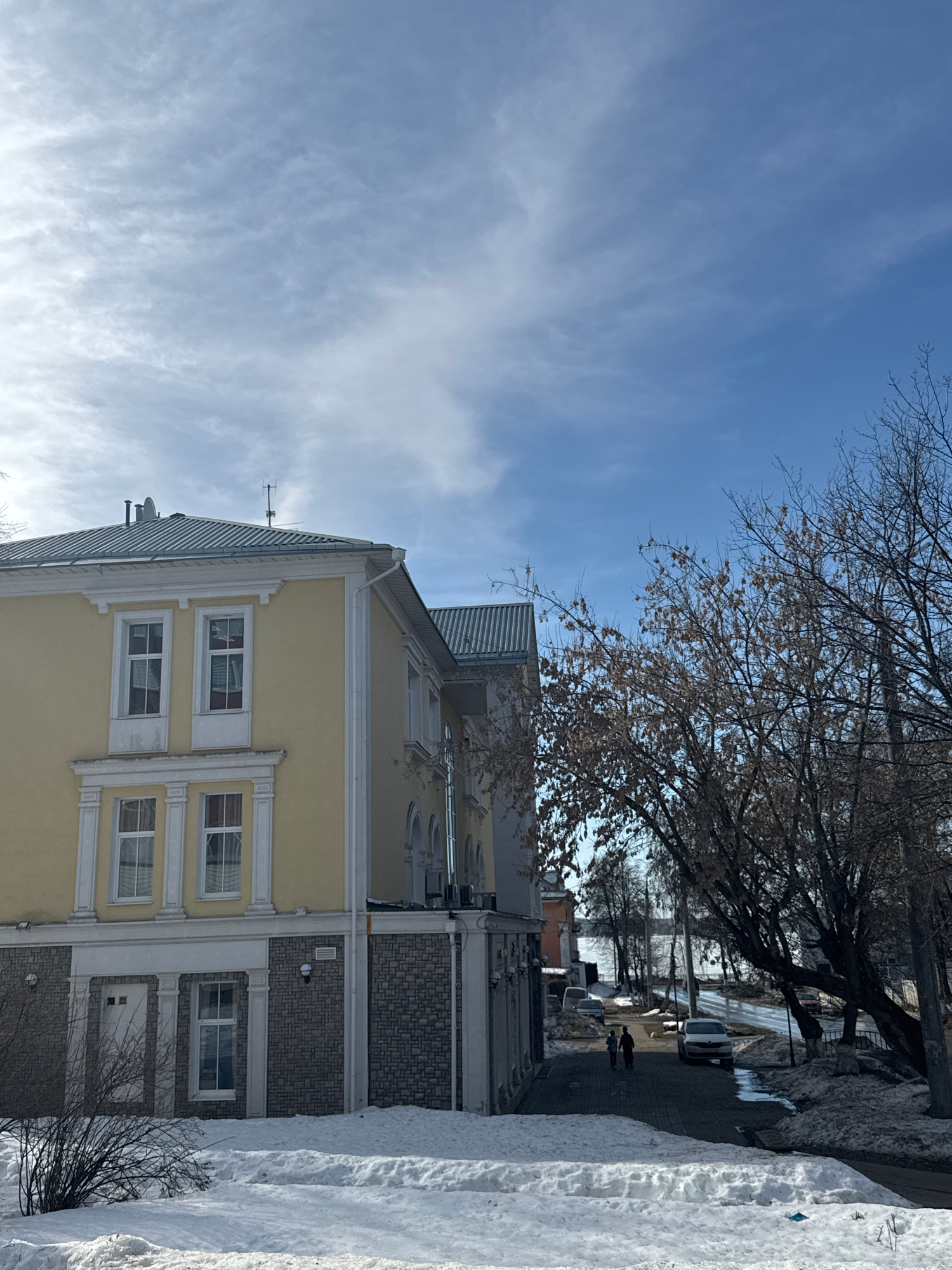 The image depicts a three-story building in Votkinsk, Russia, on a winter day. The building has a yellow facade with white trim around the windows and a gray roof. Part of the building is faced with g…read more