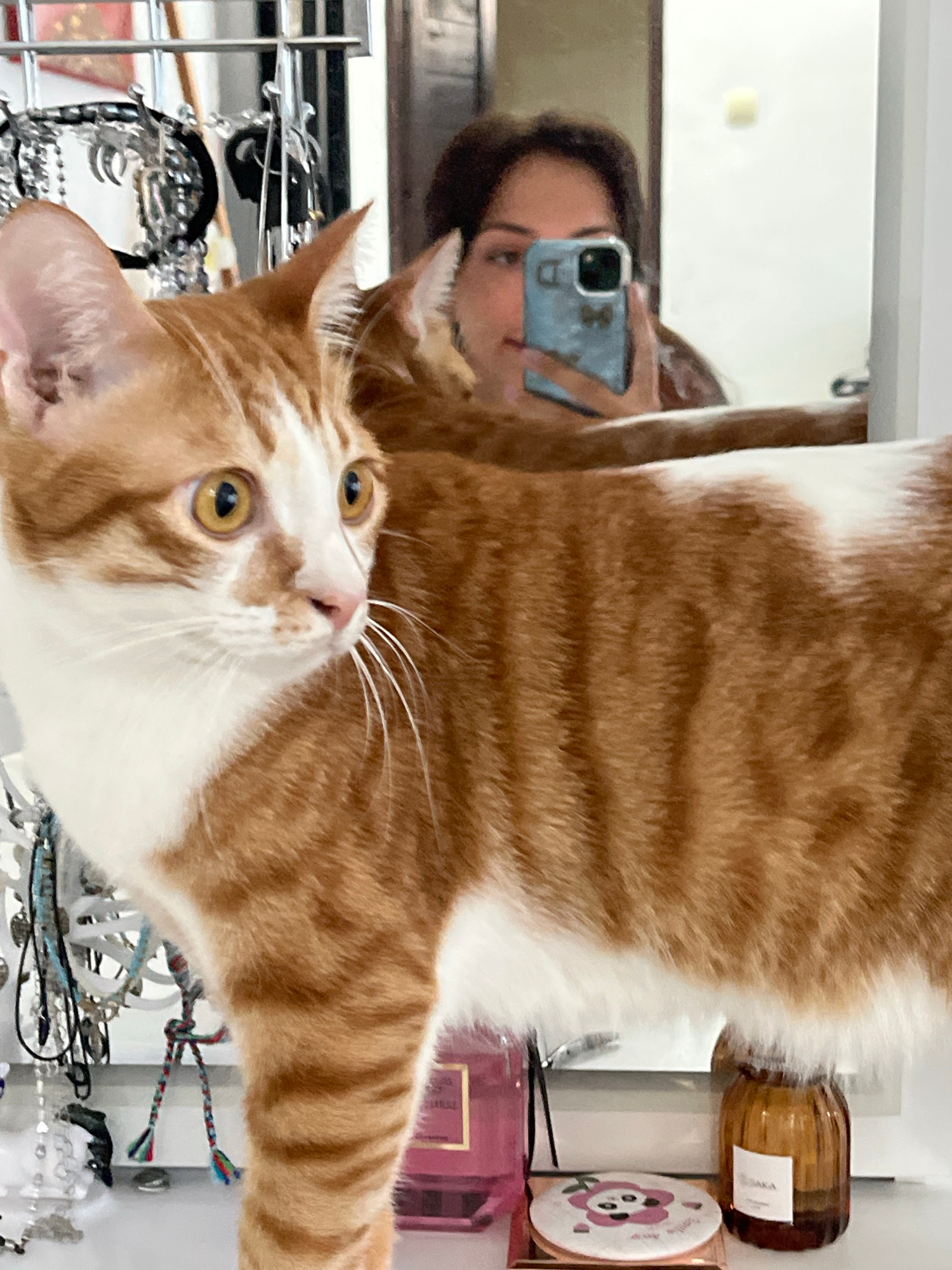 A person is taking a selfie in a mirror with an orange tabby cat. The person's face is visible in the reflection, holding a light blue phone case. The cat is in the foreground, looking up, with white…read more
