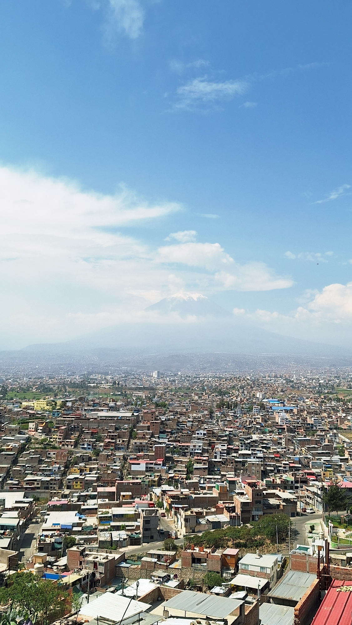 The image presents an aerial view of Jacobo Hunter, Peru. The right side of the image is densely populated with houses of varying colors, built closely together, with some interspersed trees and streeβ¦read more