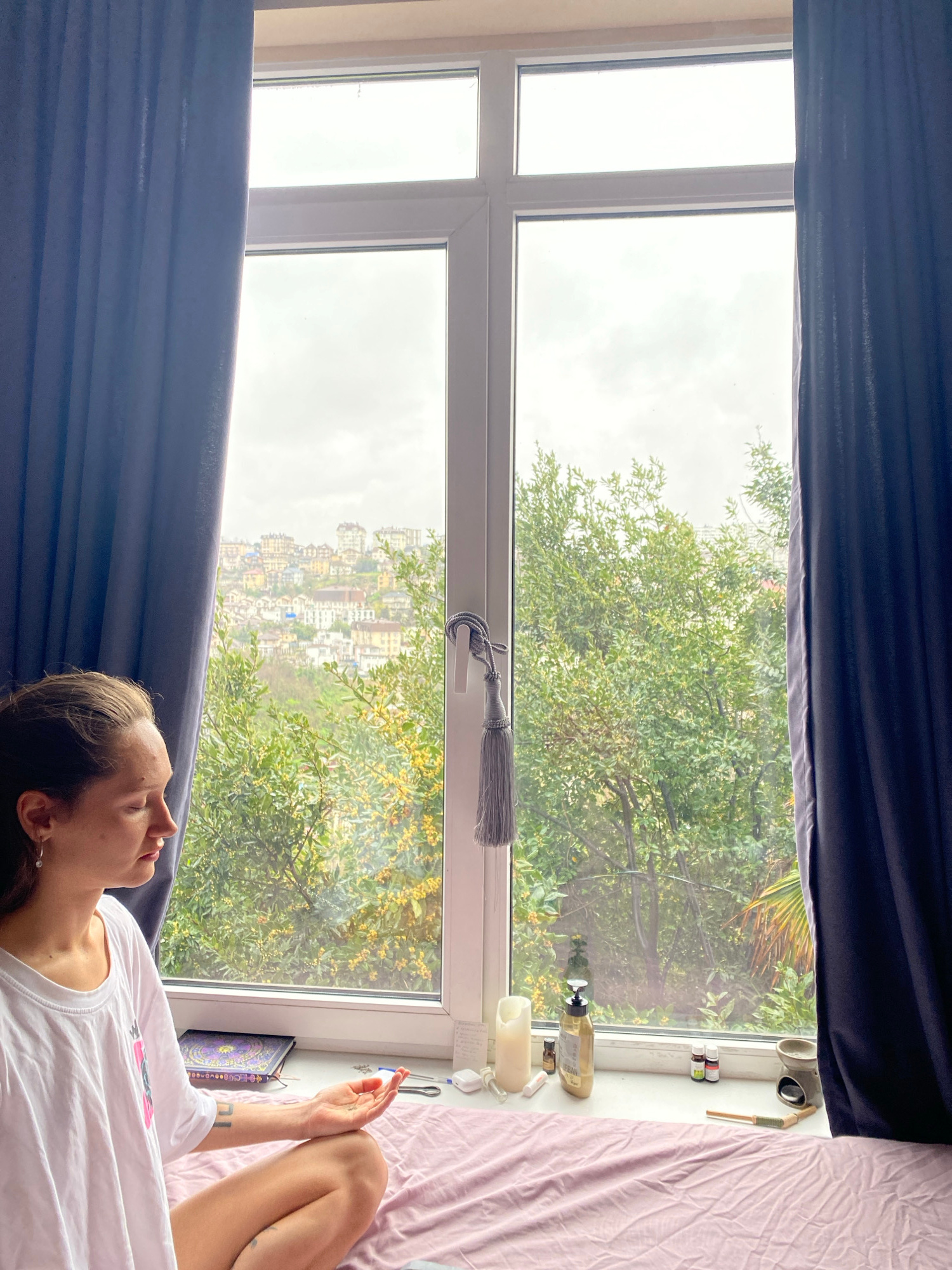 A woman is lying on a bed next to a window. She is fair-skinned with dark hair. She is wearing a white t-shirt and a small earring is visible in her left ear. She is holding a phone or small device in…read more