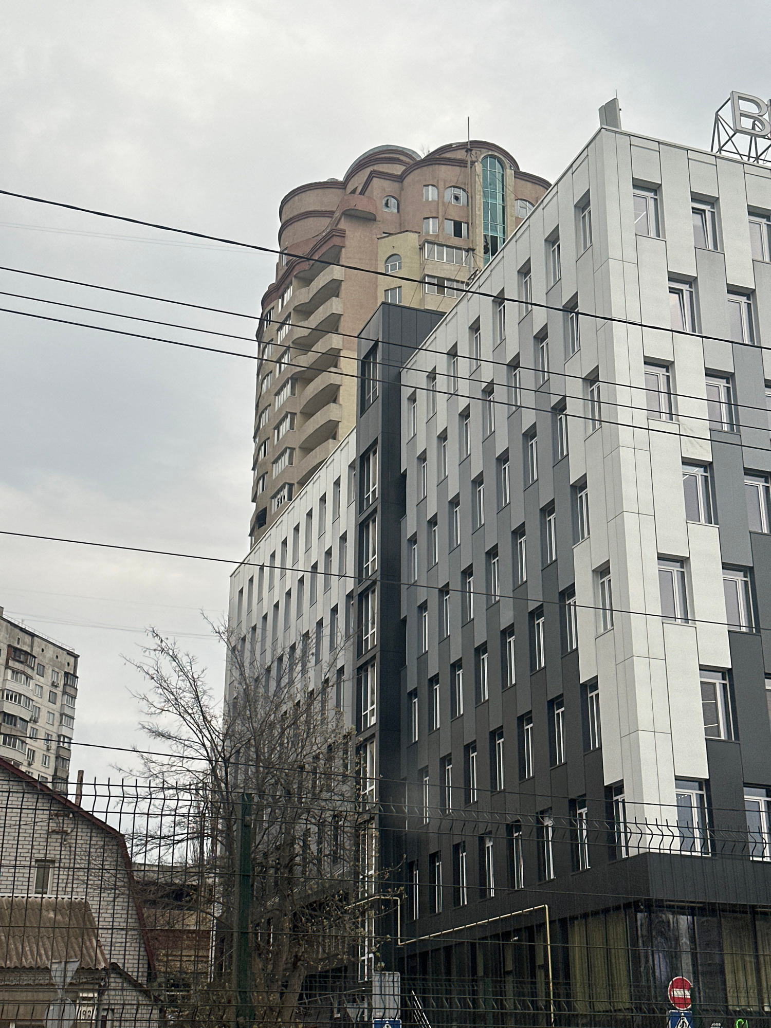 The image shows a view of buildings in Kyiv, Ukraine. A modern building with alternating grey and white panels and rectangular windows dominates the upper portion. To the left of the modern building,…read more