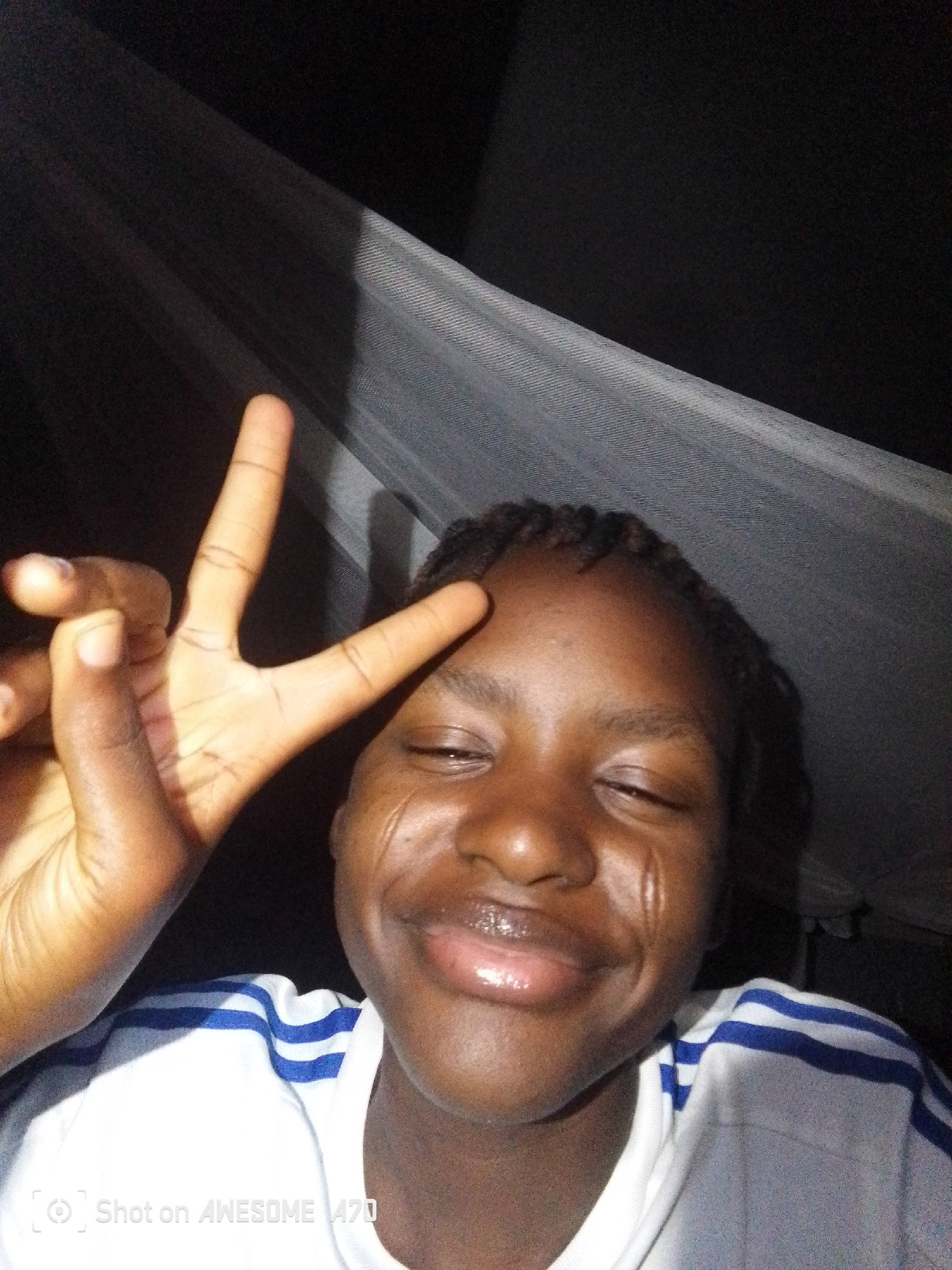 A close-up shot depicts a person with dark skin, potentially a teenager or young adult, positioned indoors under a light-colored, translucent fabric that might be a mosquito net. The person's hair is…read more