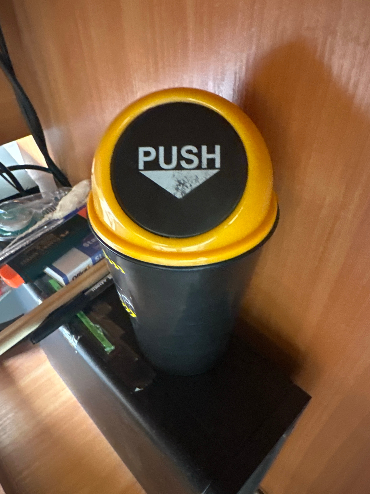 A black and yellow cylindrical trash receptacle with the word "PUSH" and a white arrow on the top is positioned inside a dark drawer. The drawer appears to contain other items, including writing utens…read more