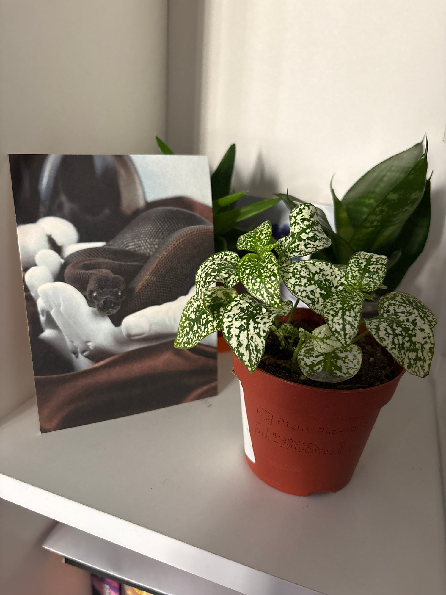 The image shows a shelf with two potted plants and a picture card. One plant has green, oval leaves and the other has smaller green leaves with white spots. The picture card depicts a snake being held…read more