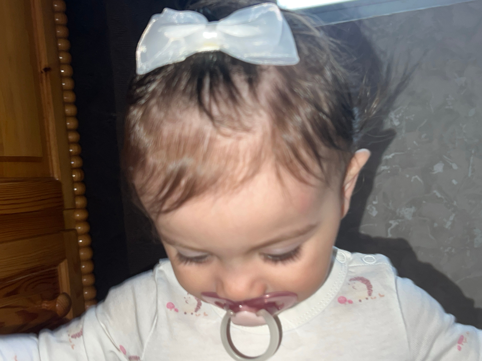 A close-up, high-angle shot captures a baby, likely a girl, indoors in Elena, Bulgaria. The baby is positioned centrally, looking downwards with a neutral, focused expression. She has dark brown hair,…read more