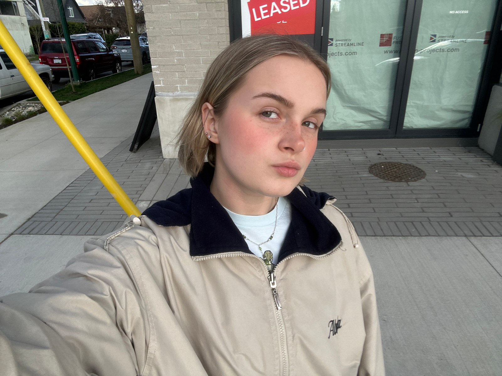 A young woman with fair skin and light brown hair is posing for a photo. She has freckles on her cheeks and a silver ring in her nostril. She is wearing a beige jacket with a black fleece collar over…read more