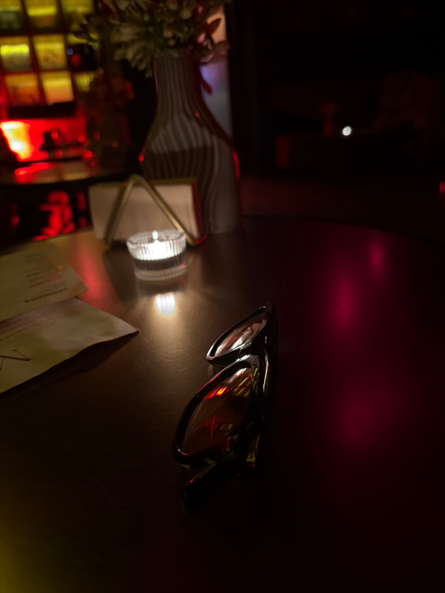 The image shows a dimly lit table in what appears to be a bar or restaurant. On the table are a pair of sunglasses, a menu or papers, a small lamp with a textured shade, and a bottle with a striped pa…read more