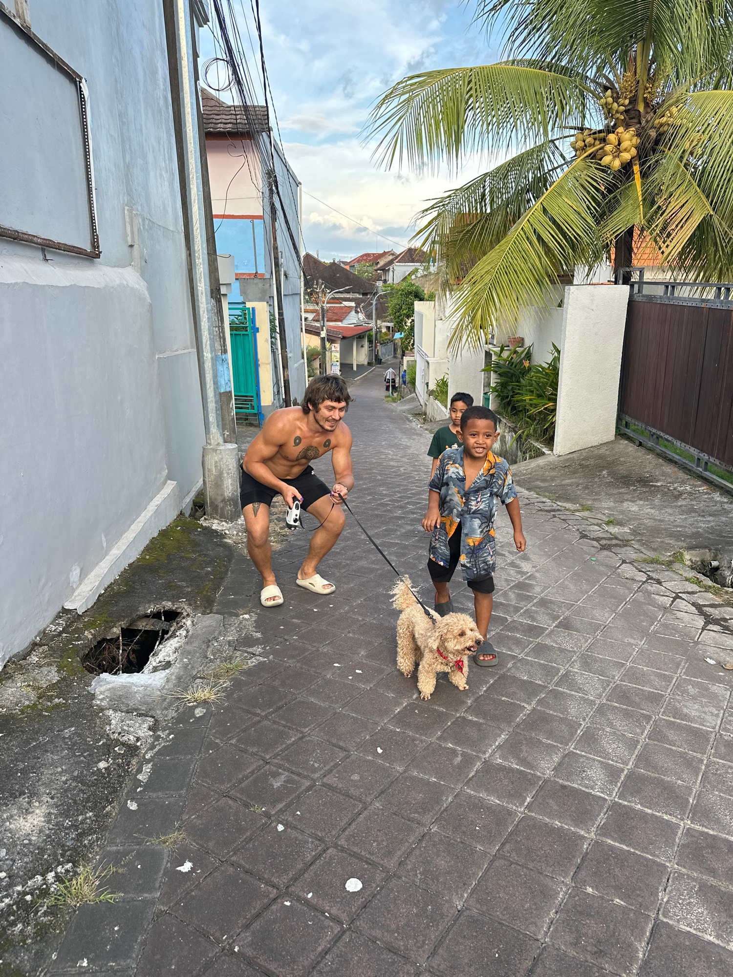In Dalung, Indonesia, a shirtless man with dark hair, tattoos on his chest and left thigh, and wearing white sandals is crouched on a grey-bricked path, holding a dog leash. The leash is attached to a…read more
