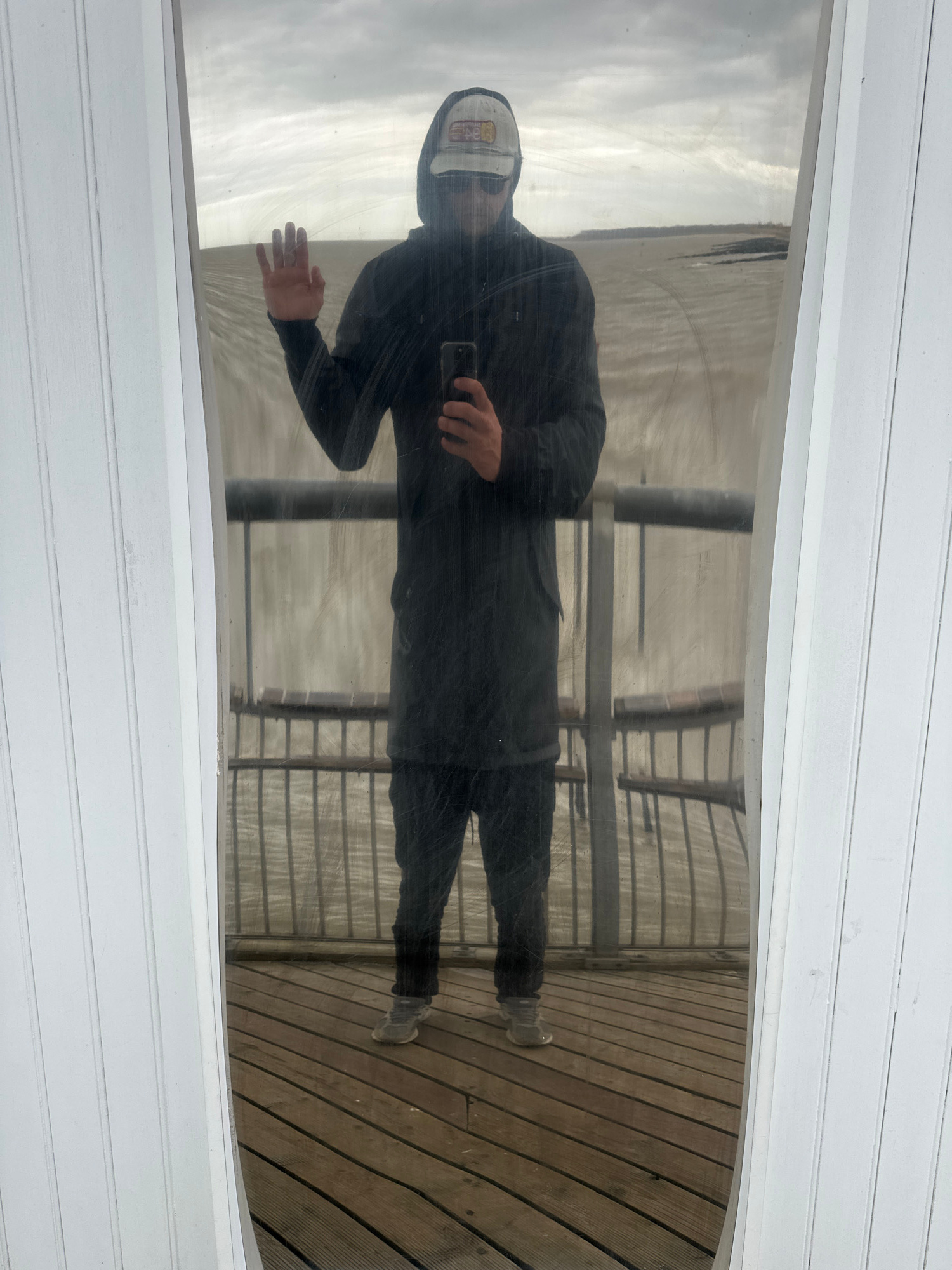 The image displays the reflection of a person in a large window or clear panel, offering a view of an outdoor environment. The person is dressed in dark clothing, comprising a hooded top and trousers,…read more