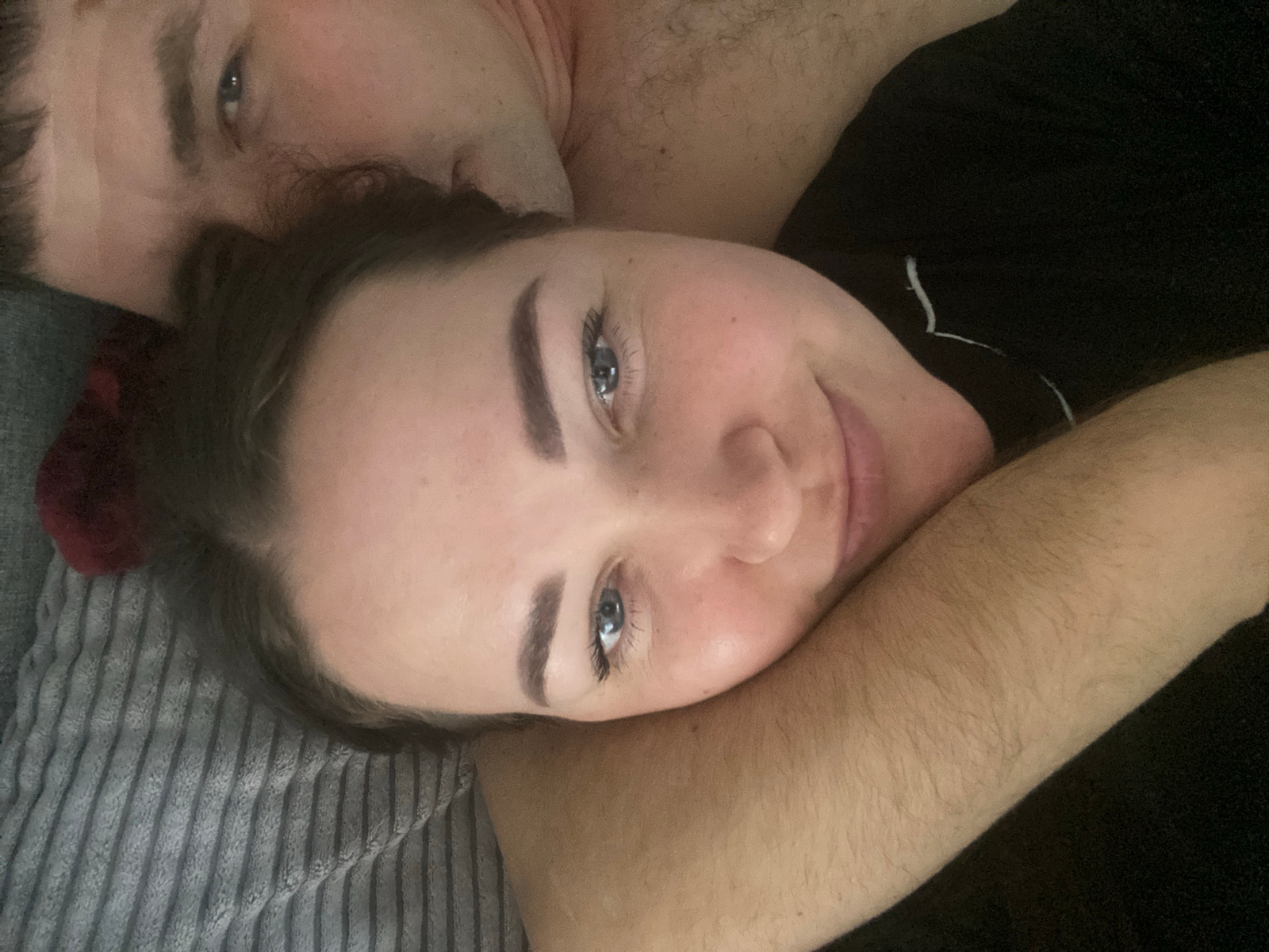 The image shows a close-up of a couple lying in bed. A woman with blue eyes is in the foreground, her head resting on a striped gray pillow. A man is partially visible behind her, his shoulder and the…read more