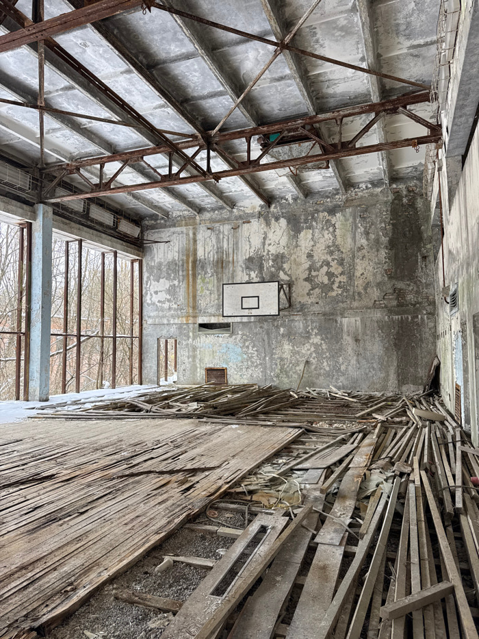 The image captures a top-down, slightly oblique view inside a severely dilapidated and abandoned building, likely a gymnasium or large hall, characterized by extensive decay and structural damage. The…read more