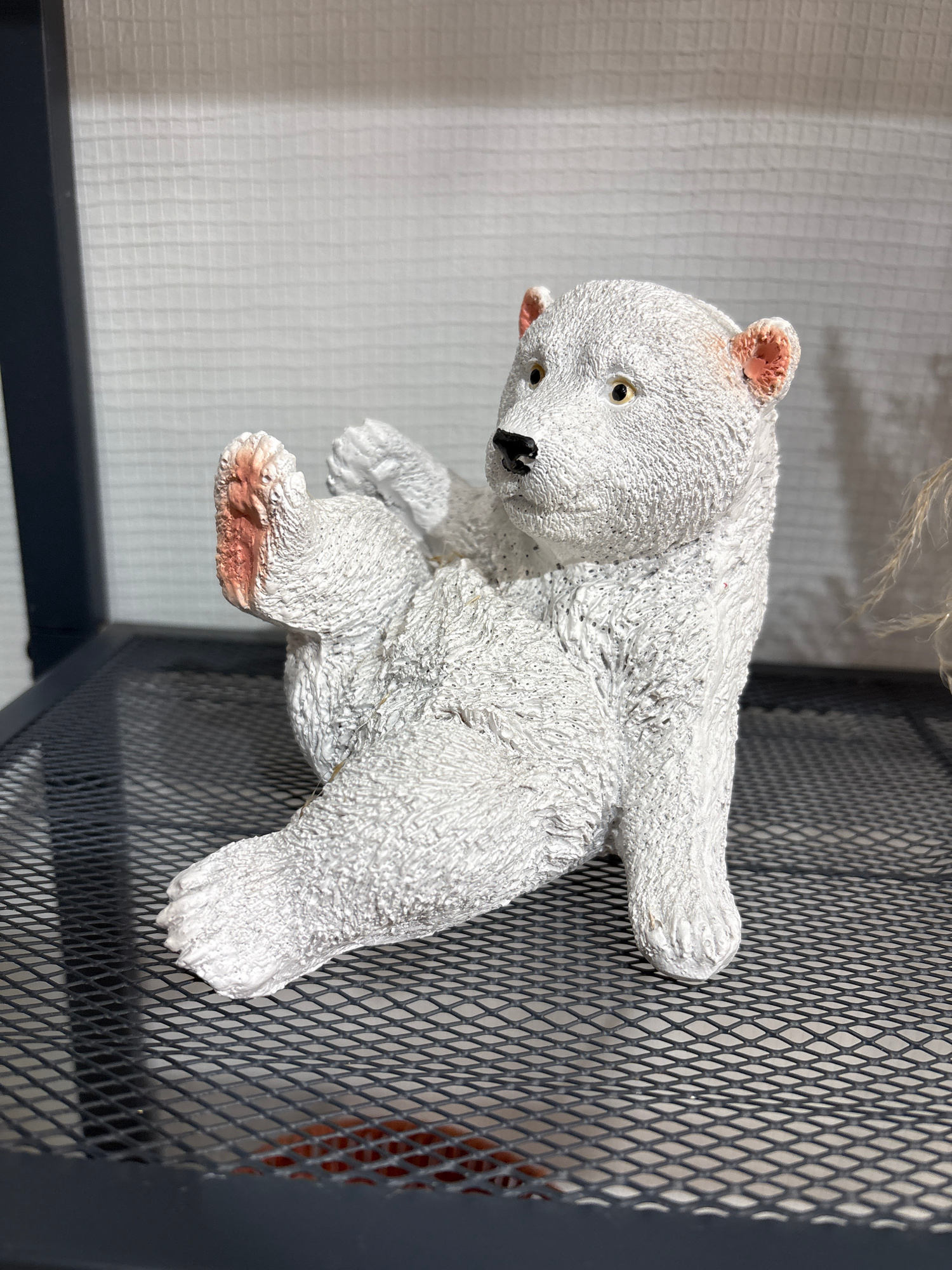 A white, textured polar bear figurine clings to the side of a black metal grid shelf. The bear has pinkish-tan accents on its ears and paws. The shelf is positioned against a textured, light grey wall…read more