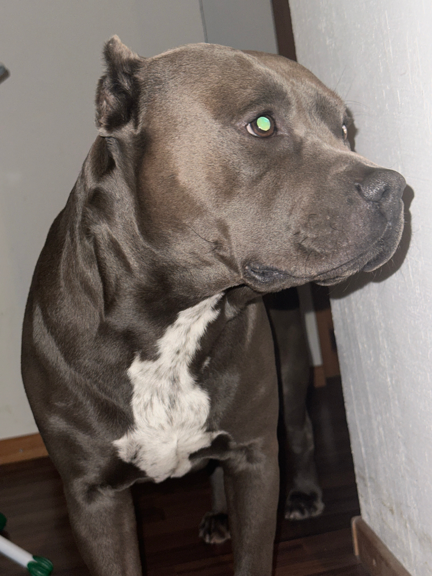 A medium-sized, blue-gray colored dog is lying down indoors. The dog has a white marking on its chest. The dog's head is tilted upwards and turned to the left, and one of its eyes is visible. The back…read more